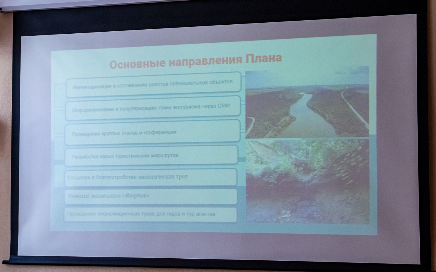 Старший научный сотрудник Государственного заповедника «Ягорлык» Н.А. Романович сделал акцент на экотуризме как элементе экологического просвещения и пропаганды бережного отношения к объектам природного наследия. Докладчик проинформировал об экскурсионной работе, ведущейся на базе заповедника, о включении школьников и студентов в наблюдение за природными процессами и о необходимости соблюдения баланса между интересами туризма и охраной редких экосистем.