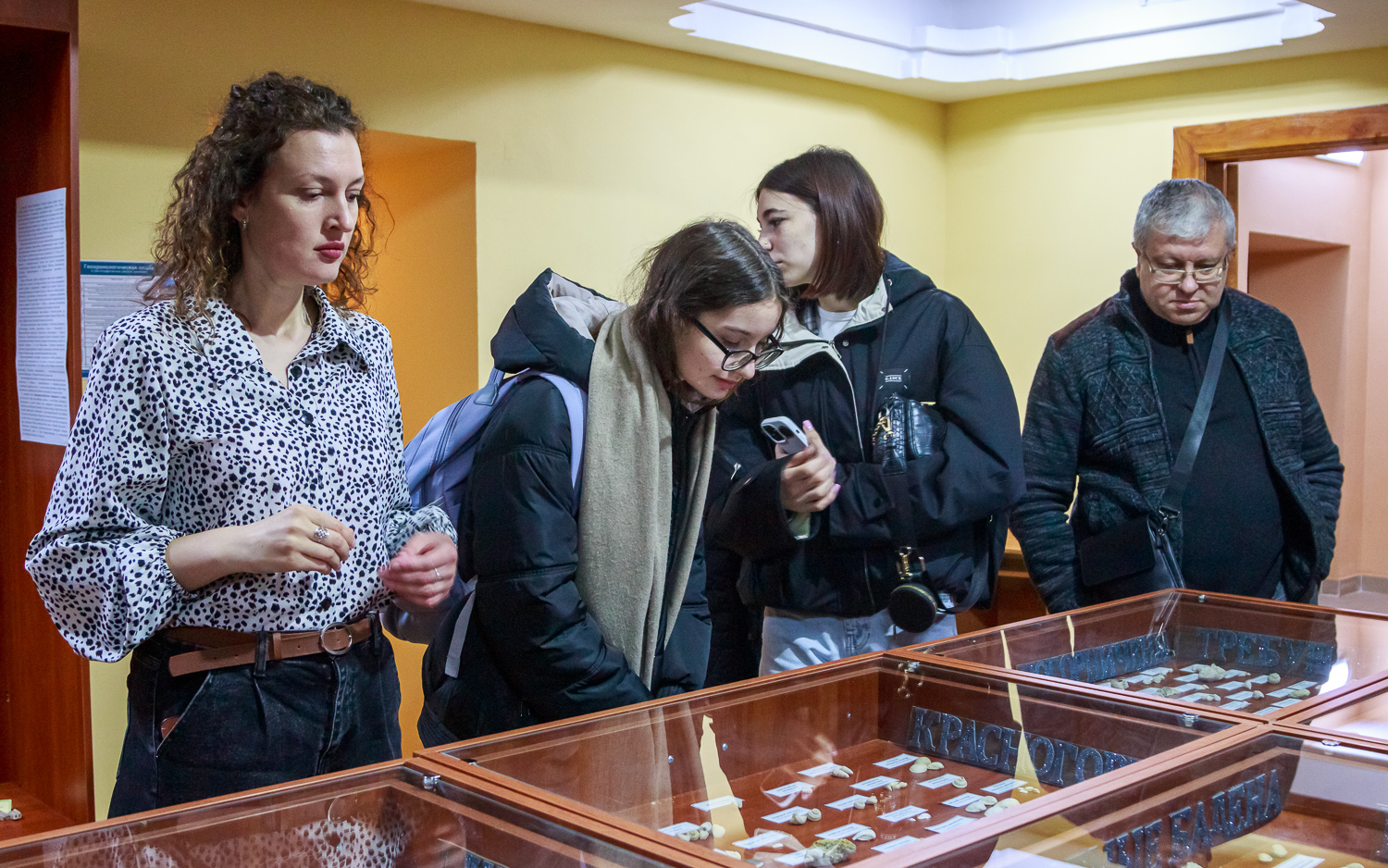 Зав. кафедрой физической географии, геологии и землеустройства Е.Н. Кравченко отметила значимость экспозиции и её ценность для университета. «Многие экспонаты были обнаружены ещё 50 лет назад. Сейчас у музея есть полноценные выставочные залы, помещения для хранения и даже препарирования образцов», – рассказала Елена Николаевна. И минералогический, и палеонтологический музеи являются подразделениями кафедры физической географии, геологии и землеустройства и предназначены в первую очередь для учебных и практических занятий студентов, изучающих историю Земли.