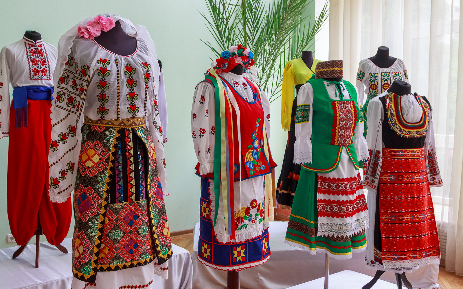 Центром экспозиции стали фигуры в традиционных костюмах народов Приднестровья – молдавском, украинском, русском, болгарском, гагаузском. Национальные костюмы были и на мастерах народного творчества.