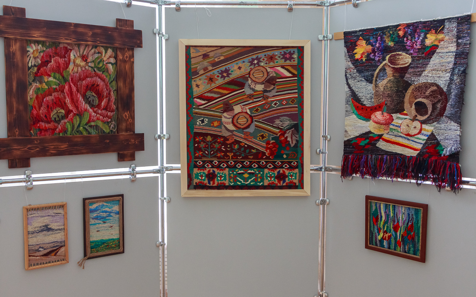 Еще одним украшением выставки стали гобелены ручной работы. Их автор, отличный работник культуры ПМР Дильнара Турсунова, отметила: «Это гобеленовое ткачество, выполняемое на ручном станке. Тематика наших работ связана с природой и культурой края – виноград, маки, кувшины. Это все – наша приднестровская стилистика».