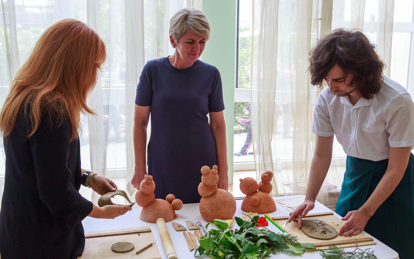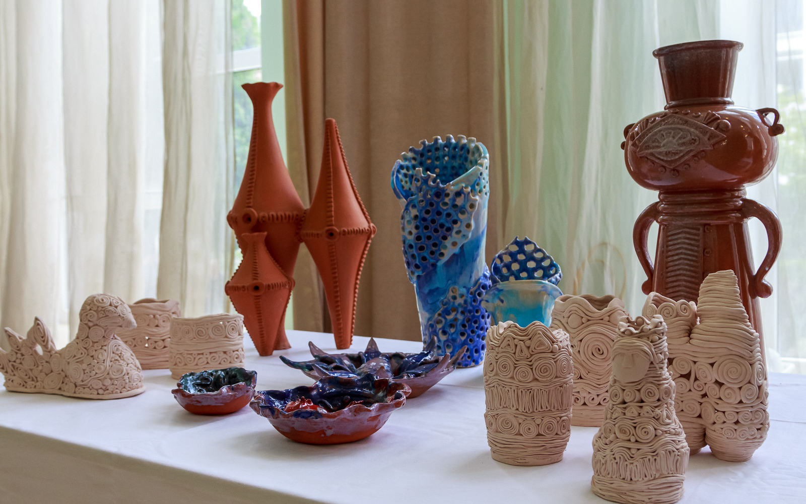 На соседнем столе расположились работы студентов Бендерского высшего художественного колледжа им. В.И. Постойкина. Студенты третьего курса Сергей Смирнов и Надежда Куриловская представили свои керамические изделия. Примечательно, что все они выполнены в разных техниках, чтобы можно было наглядно увидеть, как изменяется глина в разных условиях.