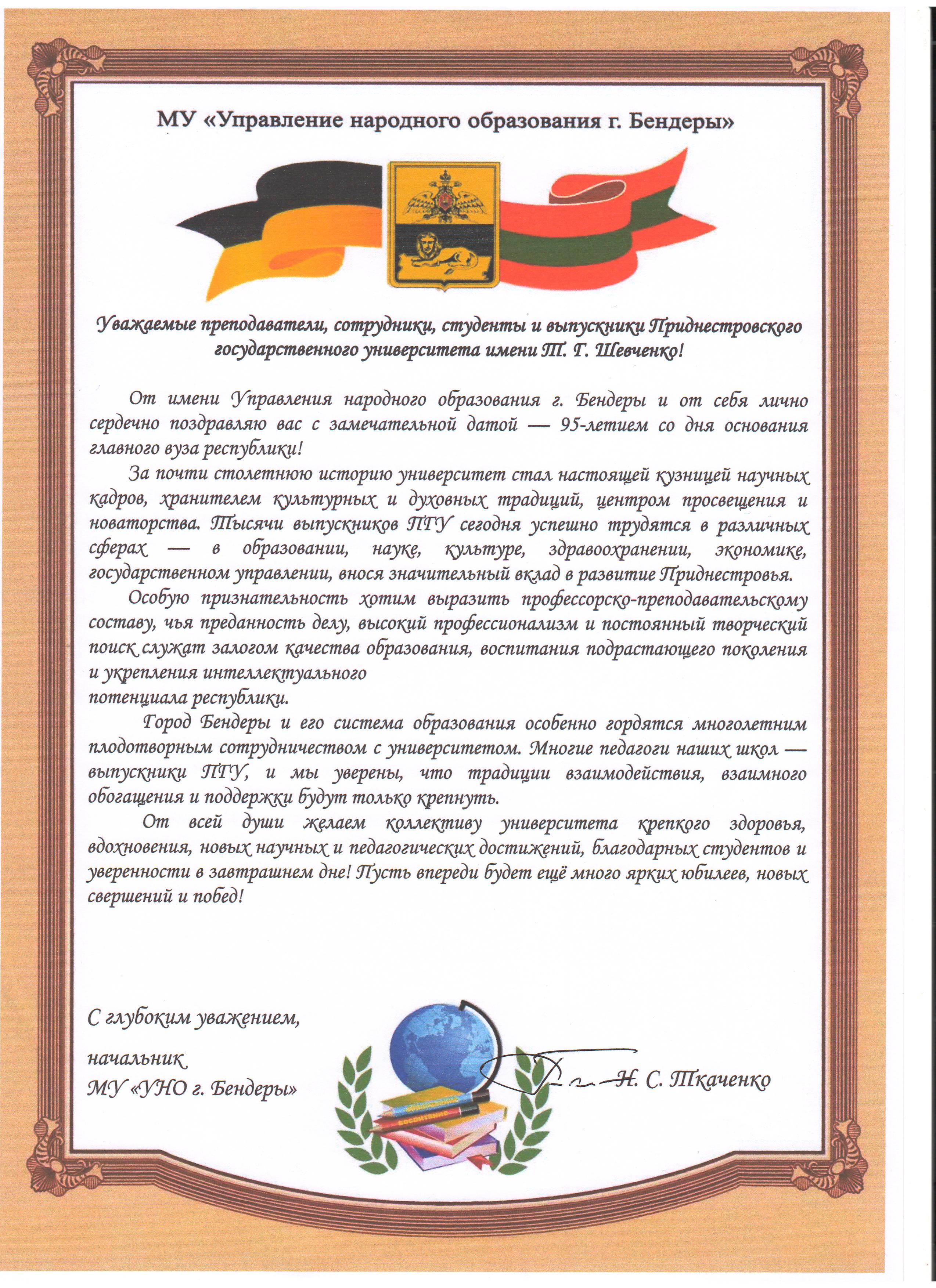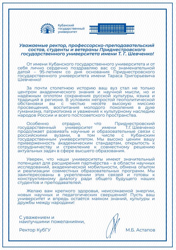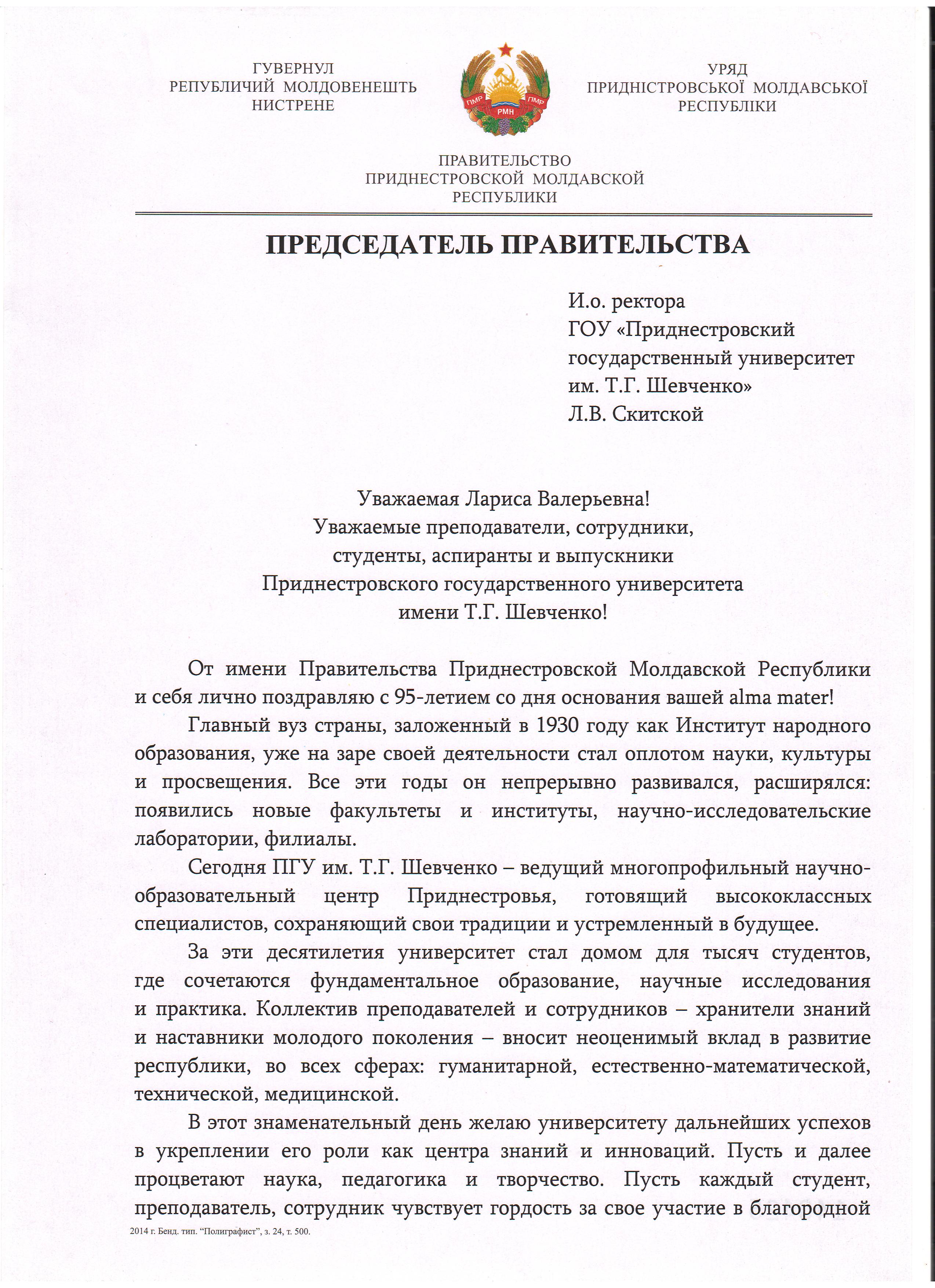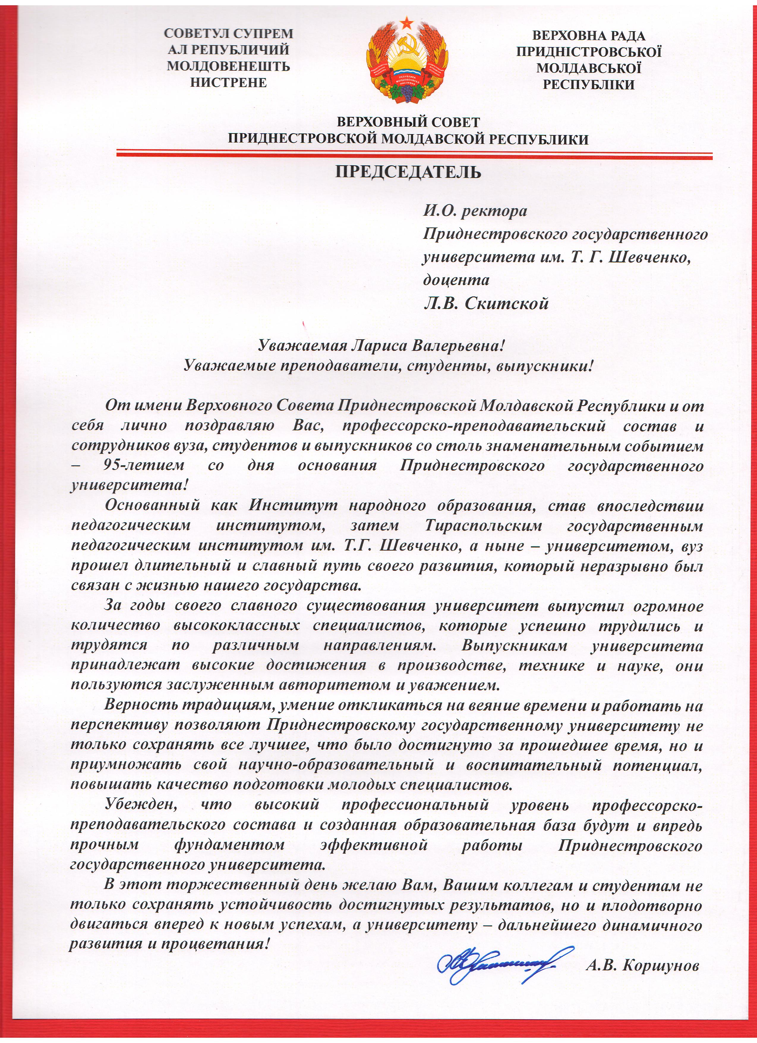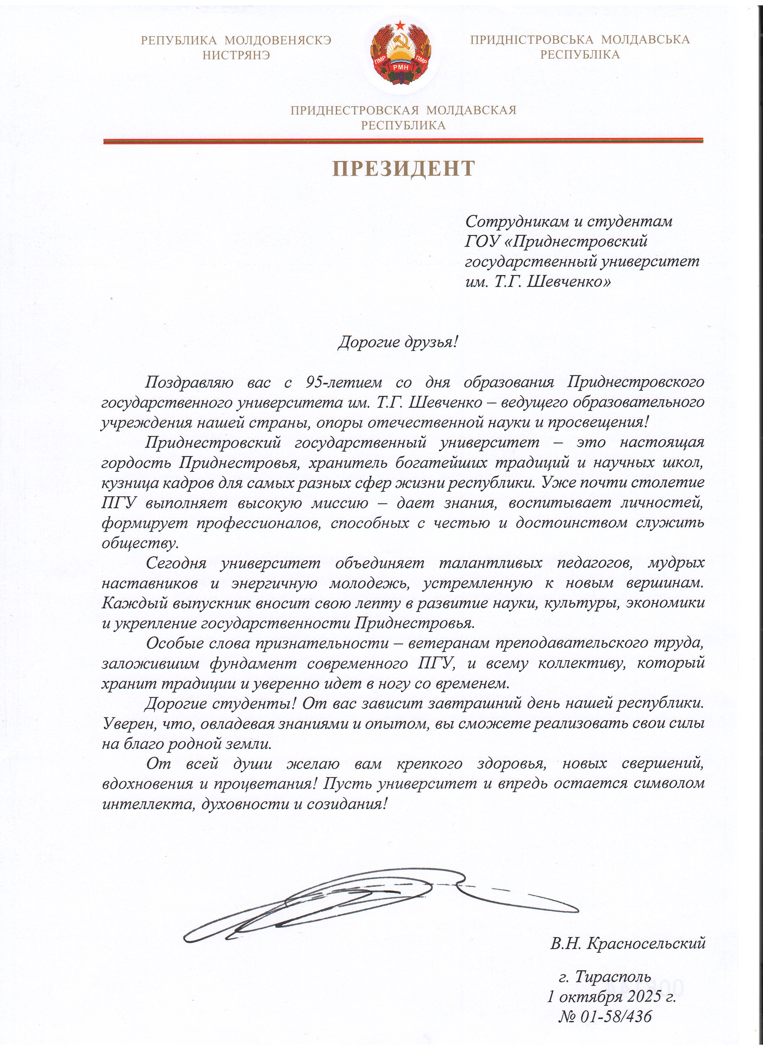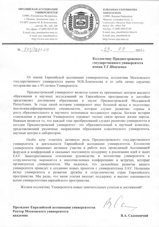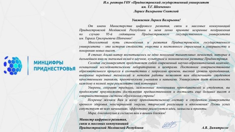 В честь 95-летия Приднестровского государственного университета имени Т. Г. Шевченко в адрес вуза поступило множество поздравлений. Своё уважение и признательность выразили государственные структуры, образовательные и научные организации, партнёрские учреждения ближнего и дальнего зарубежья.