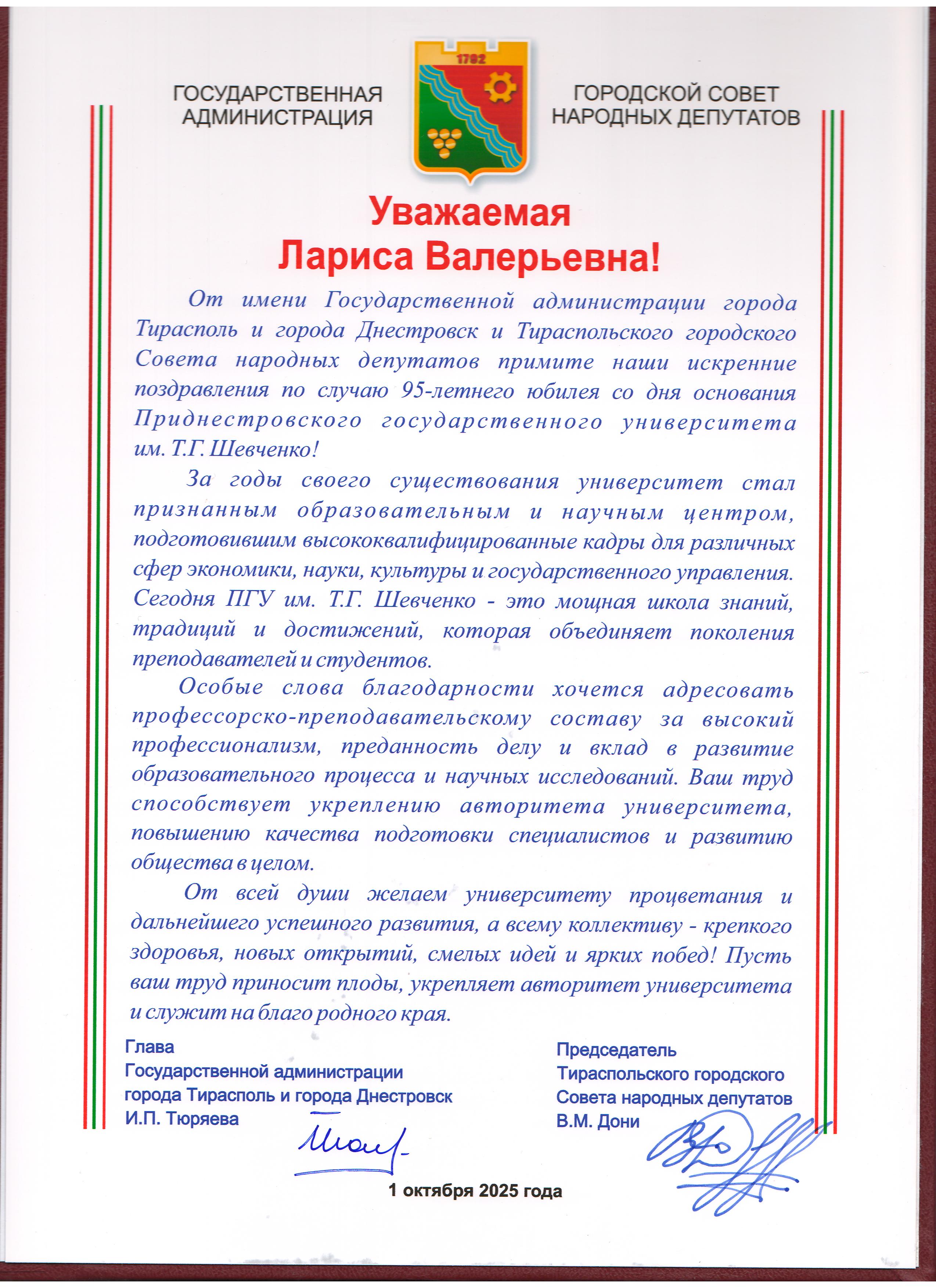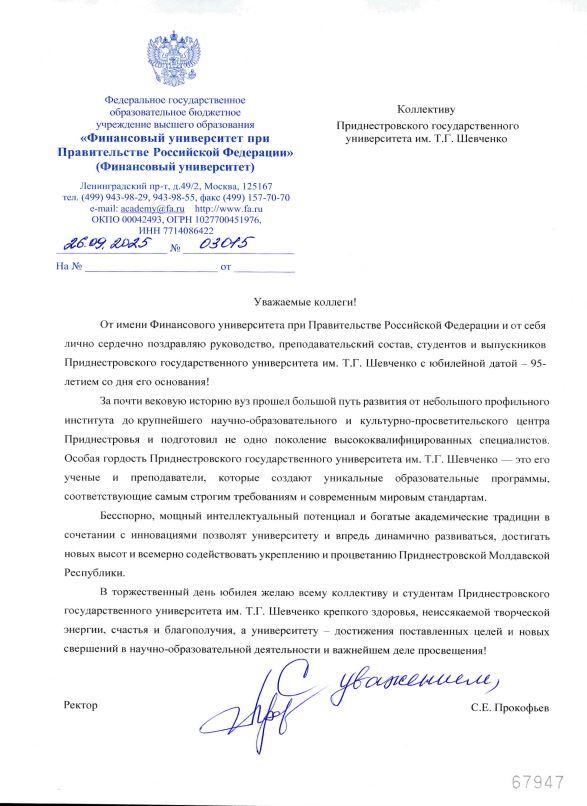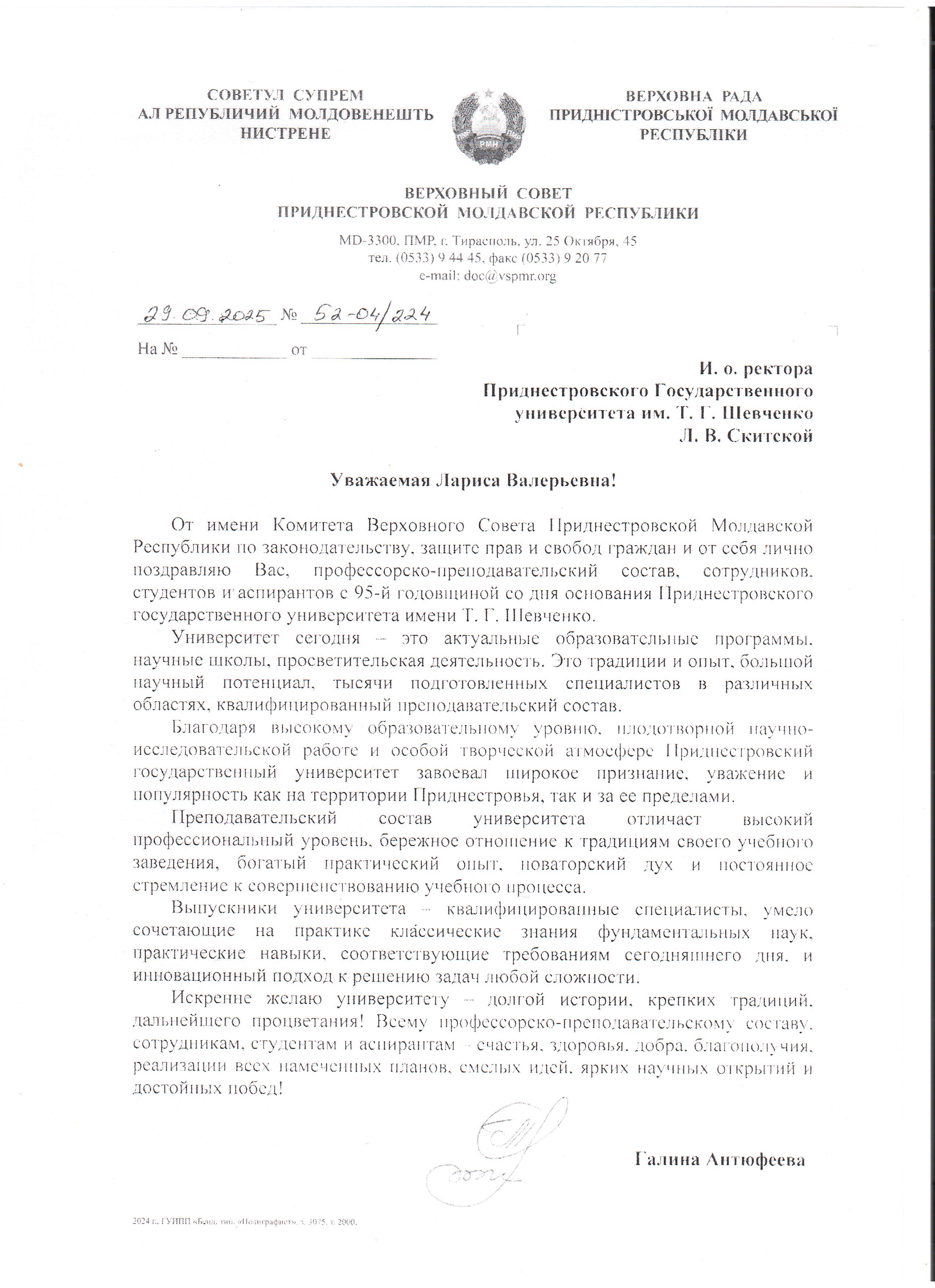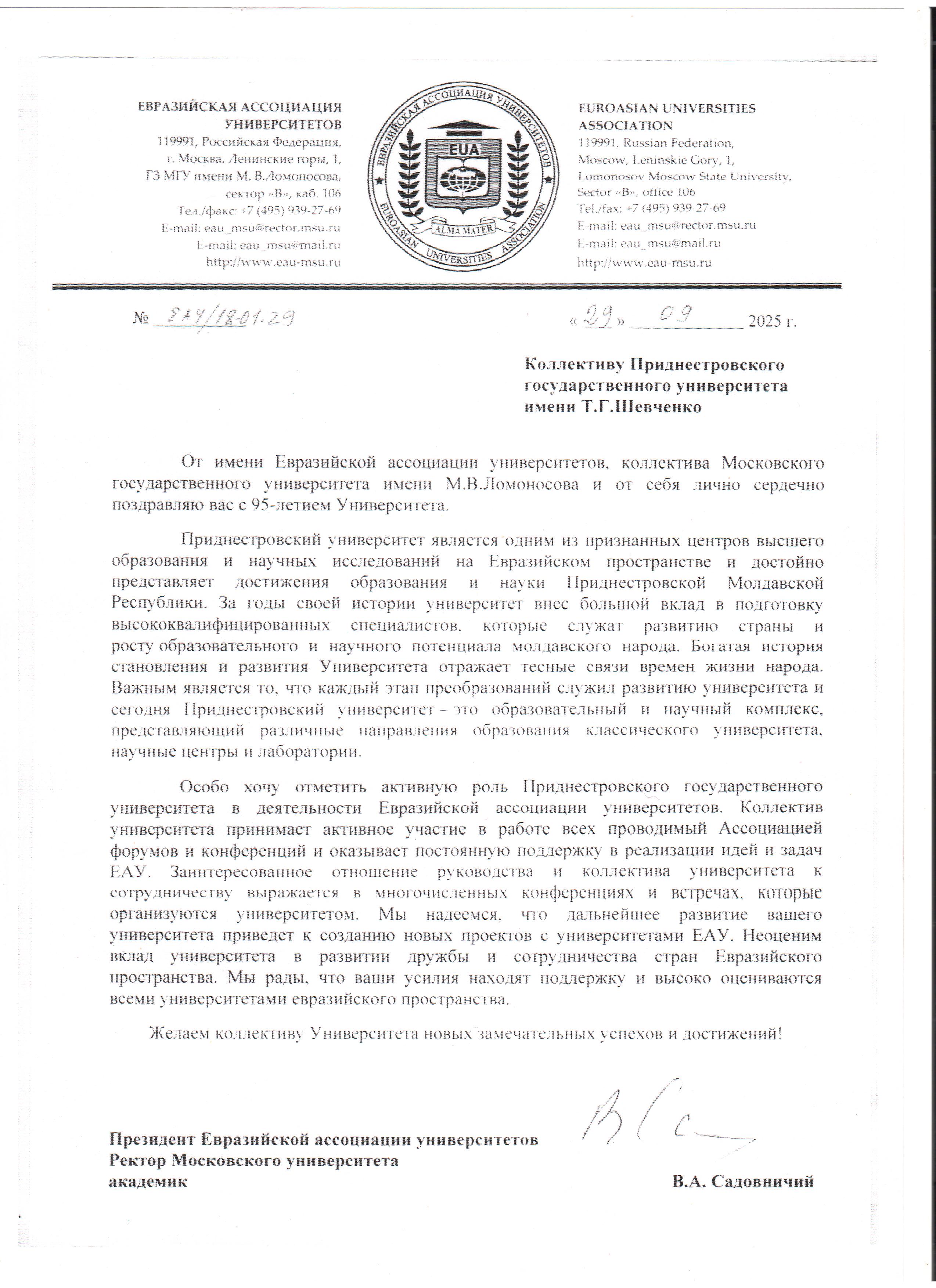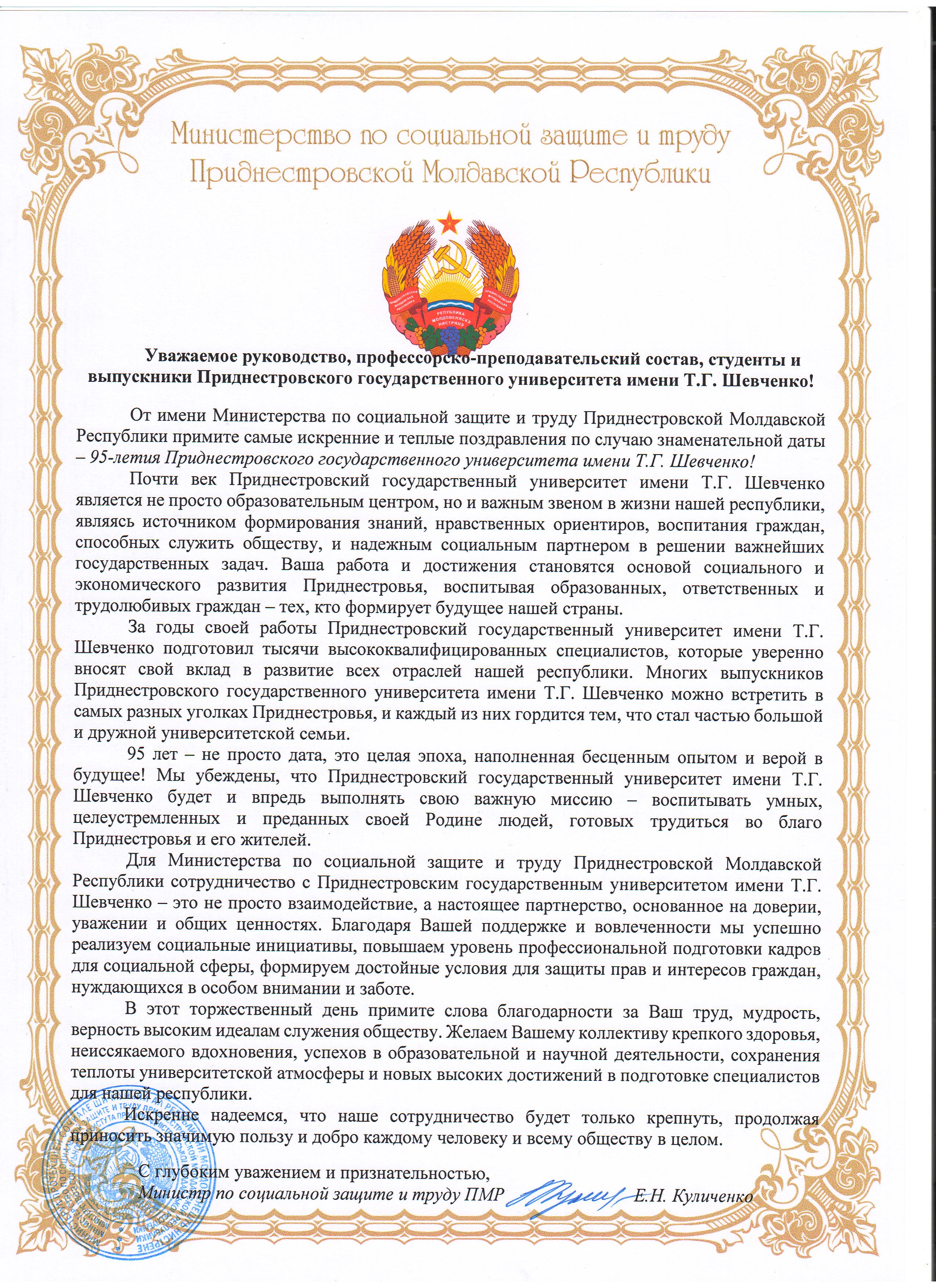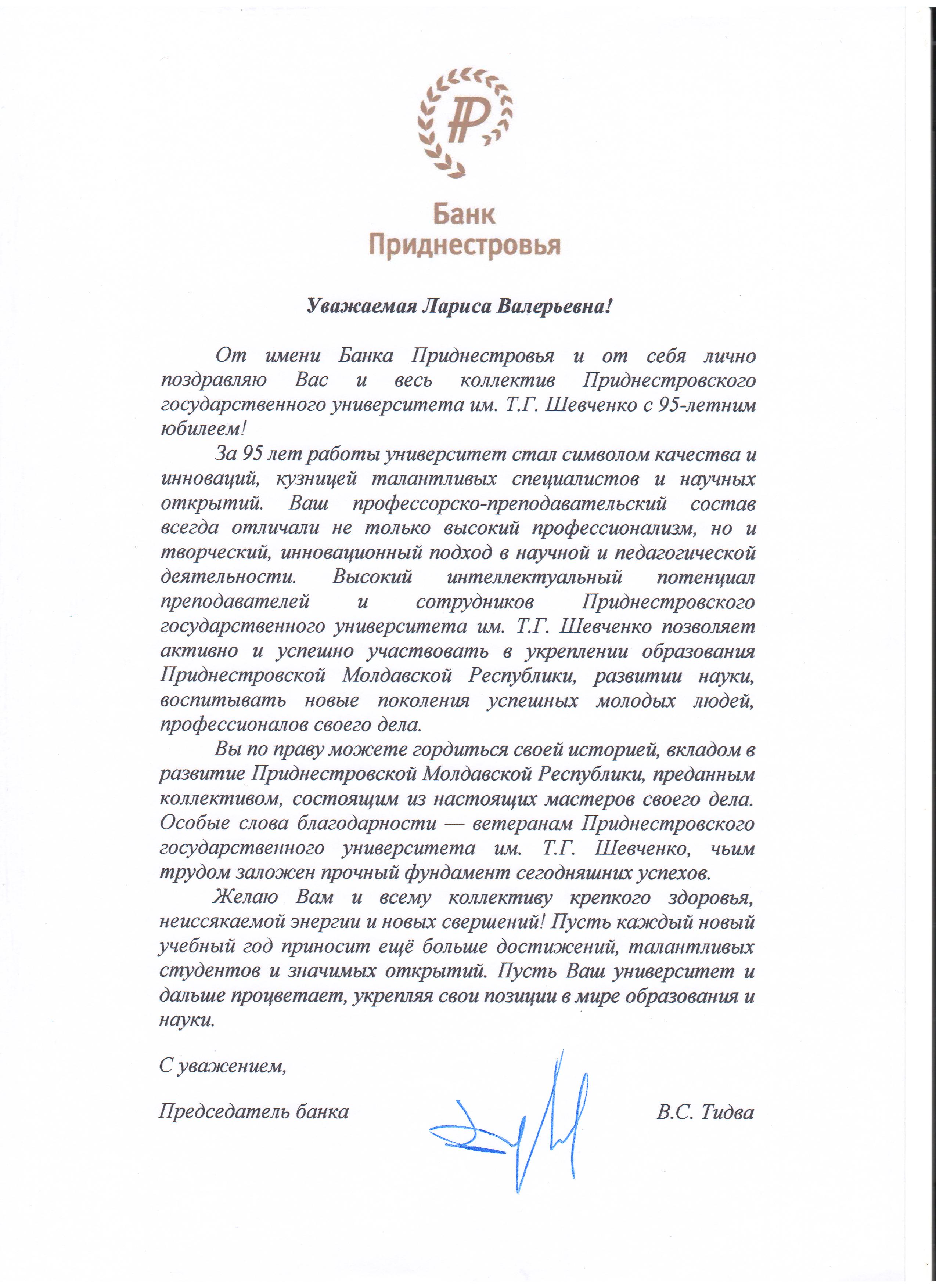 В честь 95-летия Приднестровского государственного университета имени Т. Г. Шевченко в адрес вуза поступило множество поздравлений. Своё уважение и признательность выразили государственные структуры, образовательные и научные организации, партнёрские учреждения ближнего и дальнего зарубежья.