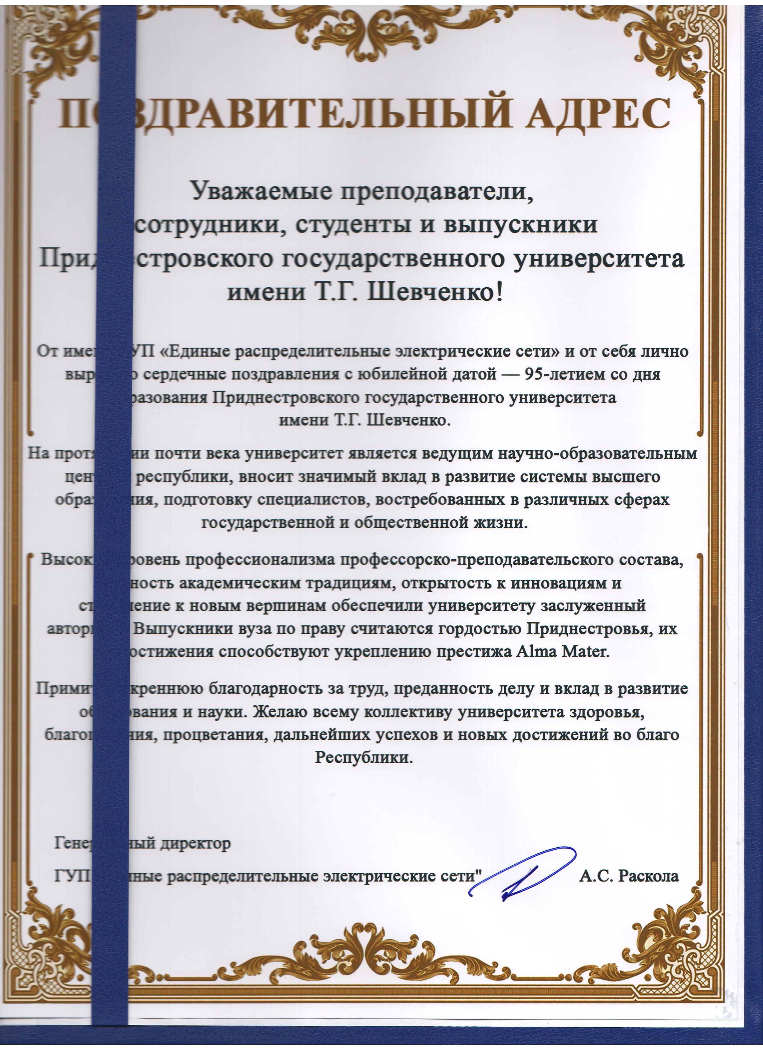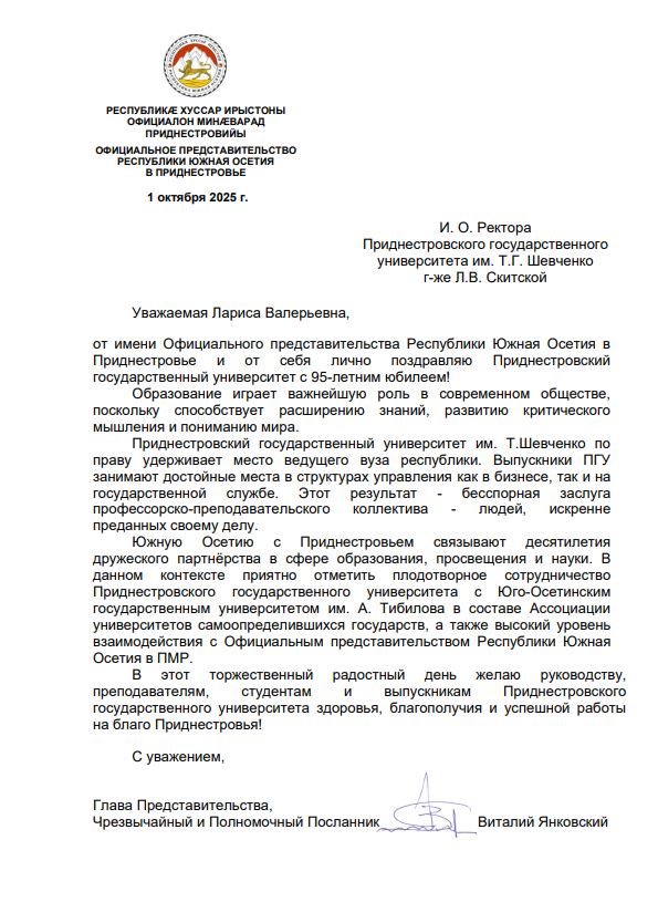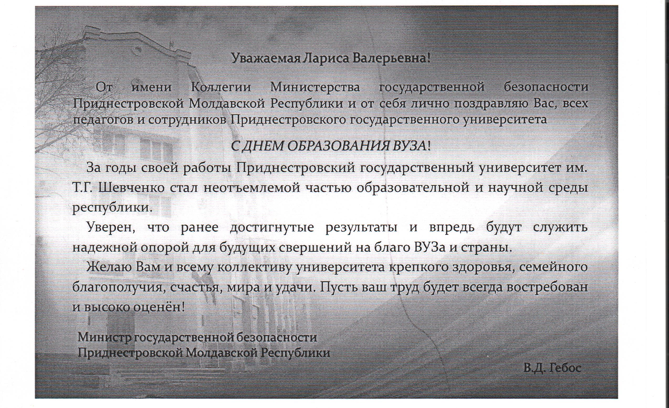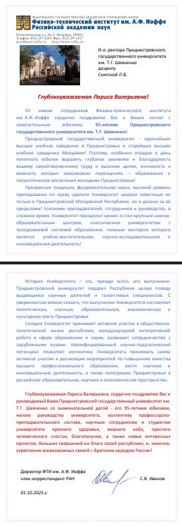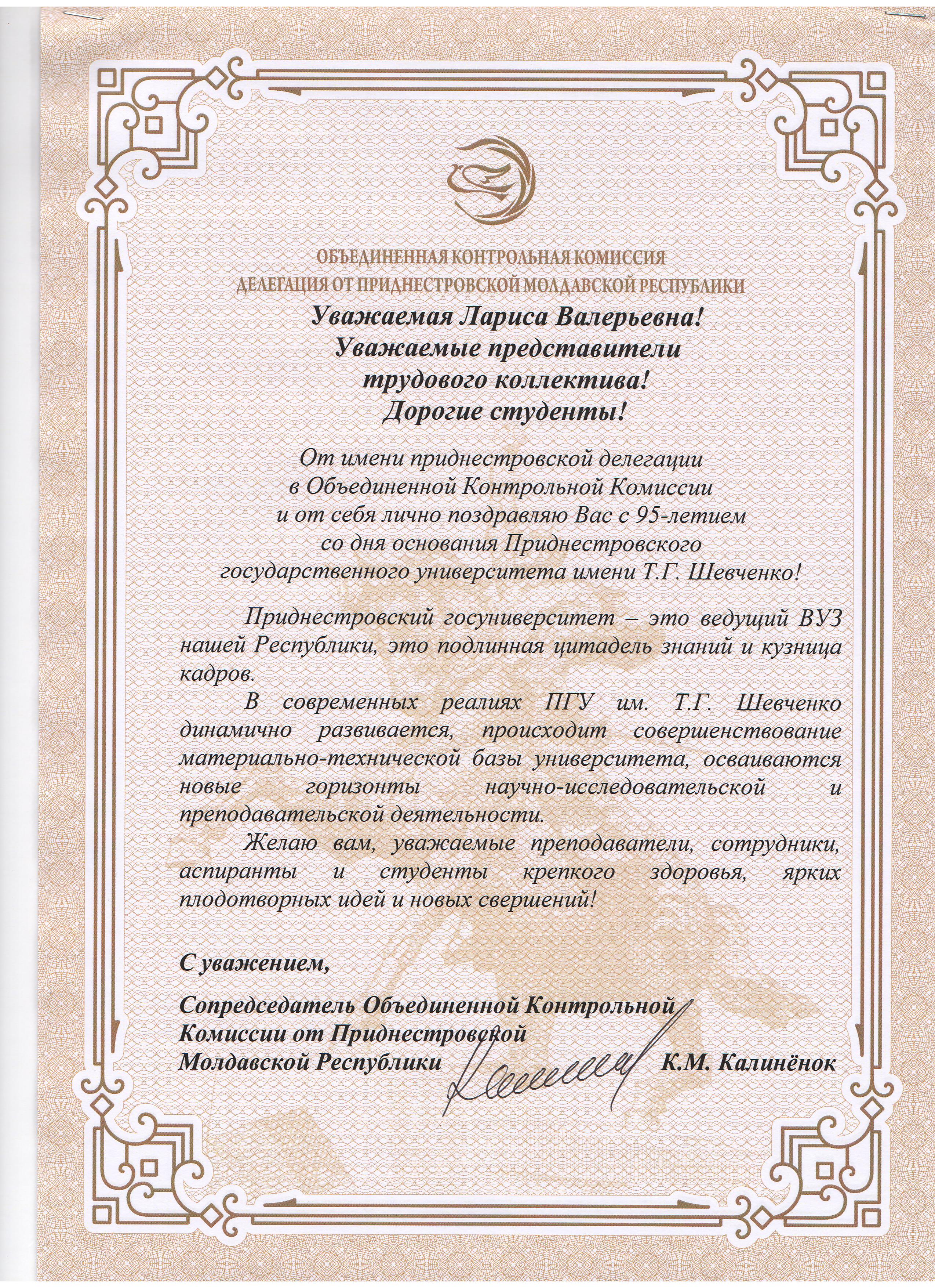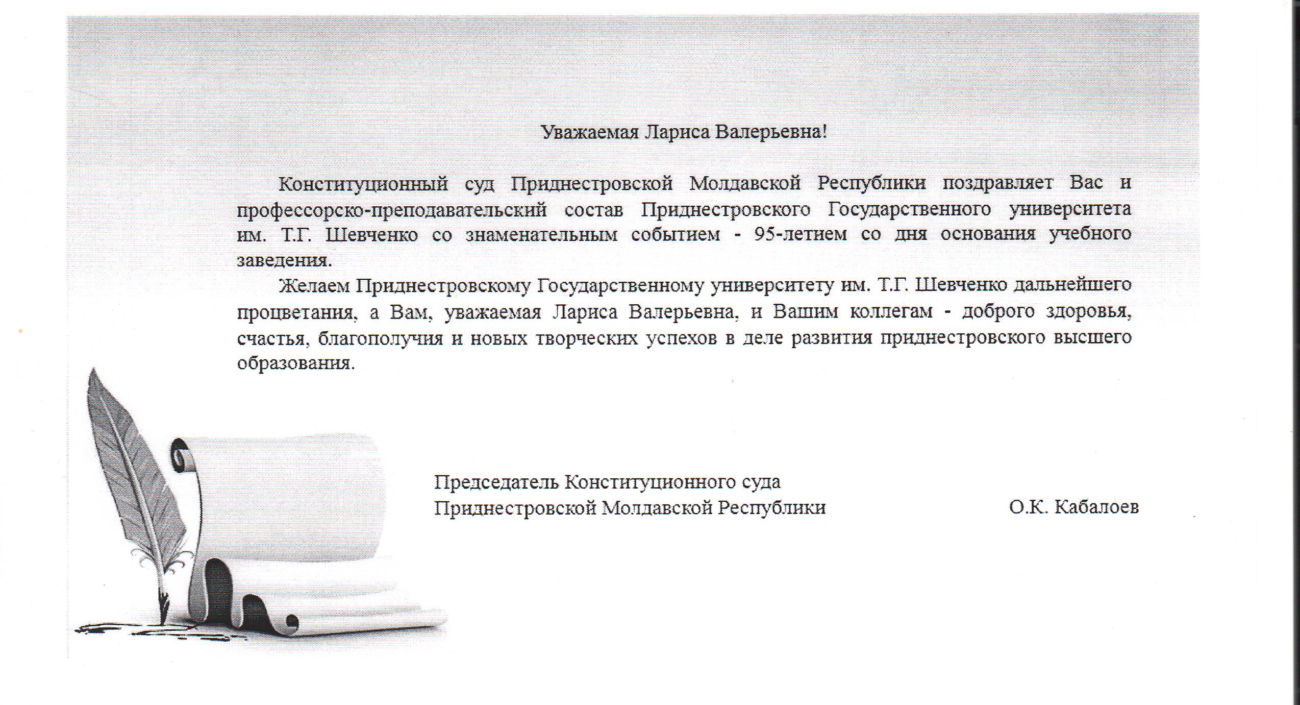 В честь 95-летия Приднестровского государственного университета имени Т. Г. Шевченко в адрес вуза поступило множество поздравлений. Своё уважение и признательность выразили государственные структуры, образовательные и научные организации, партнёрские учреждения ближнего и дальнего зарубежья.