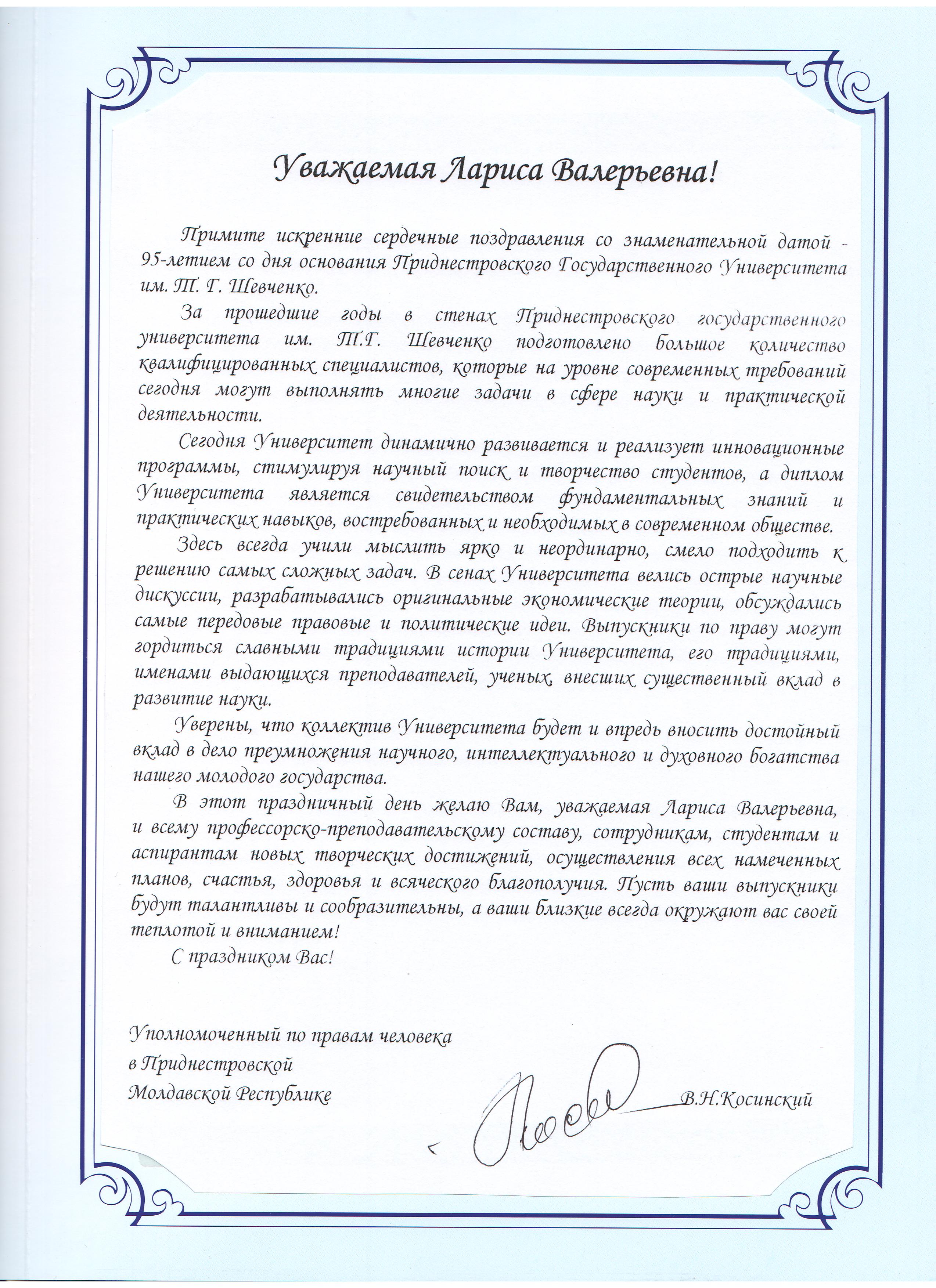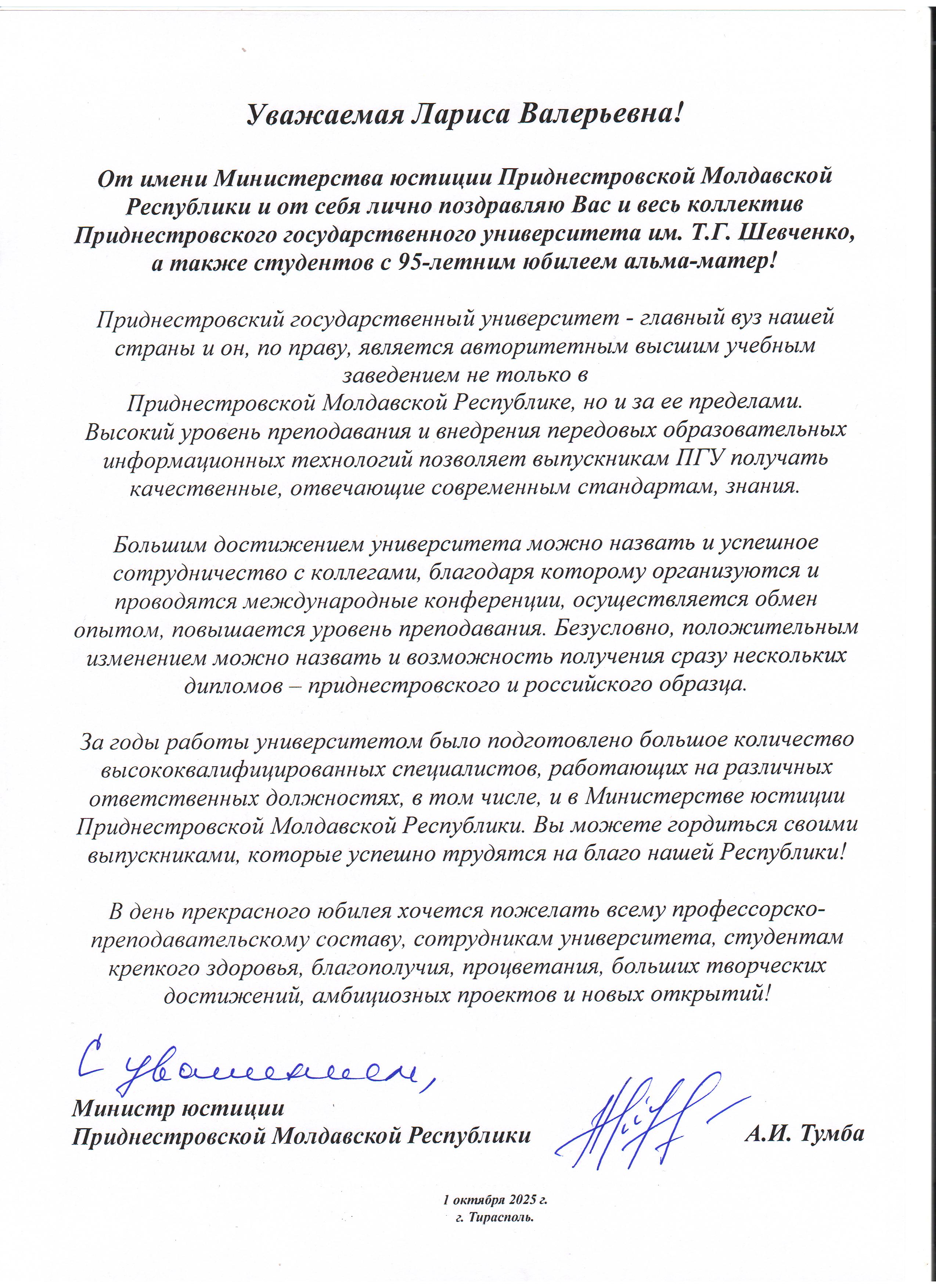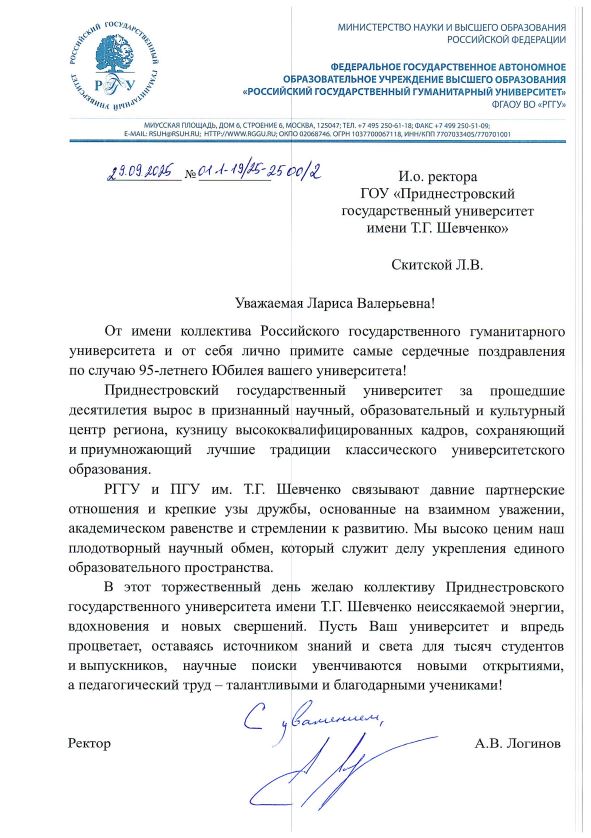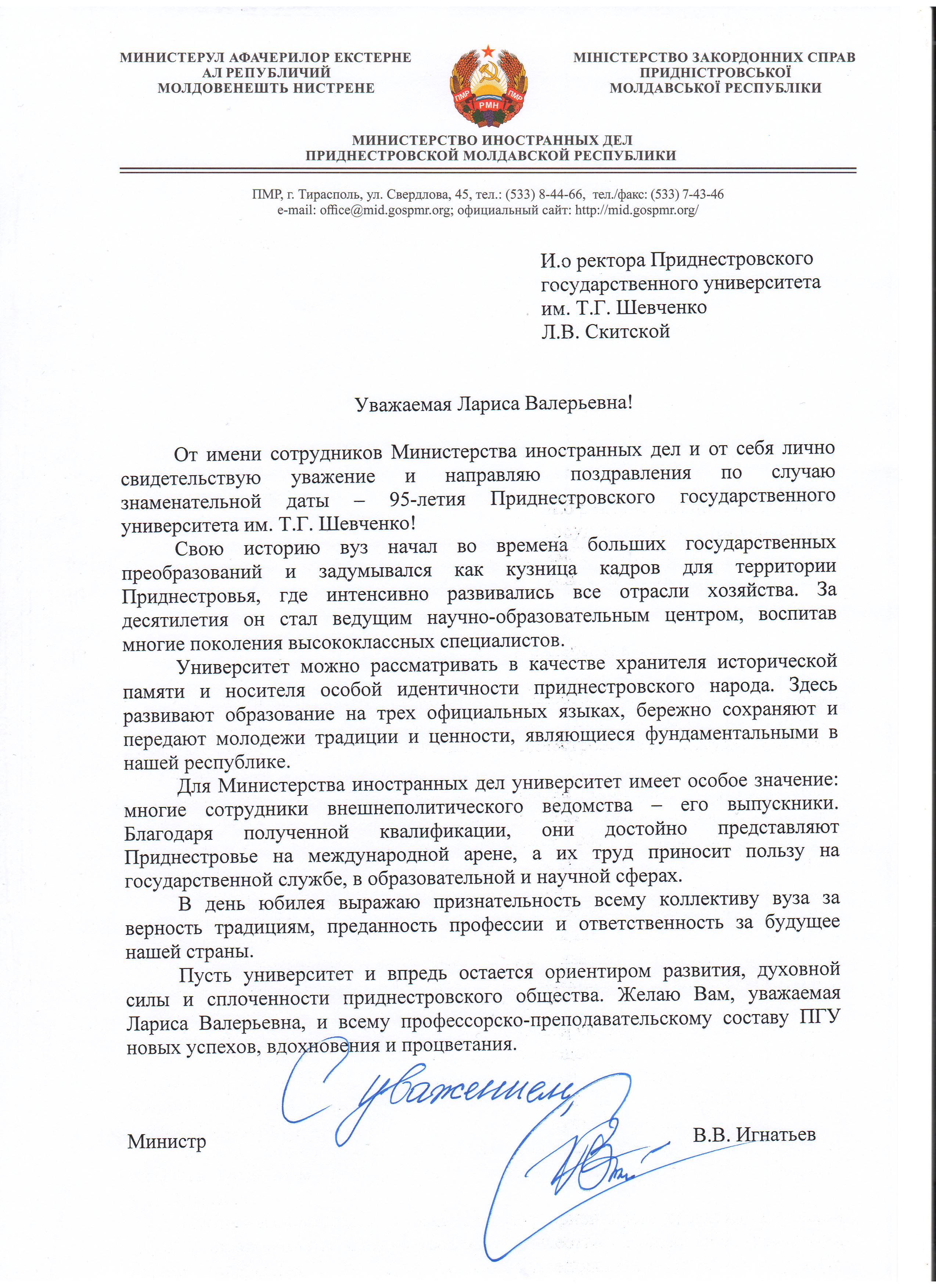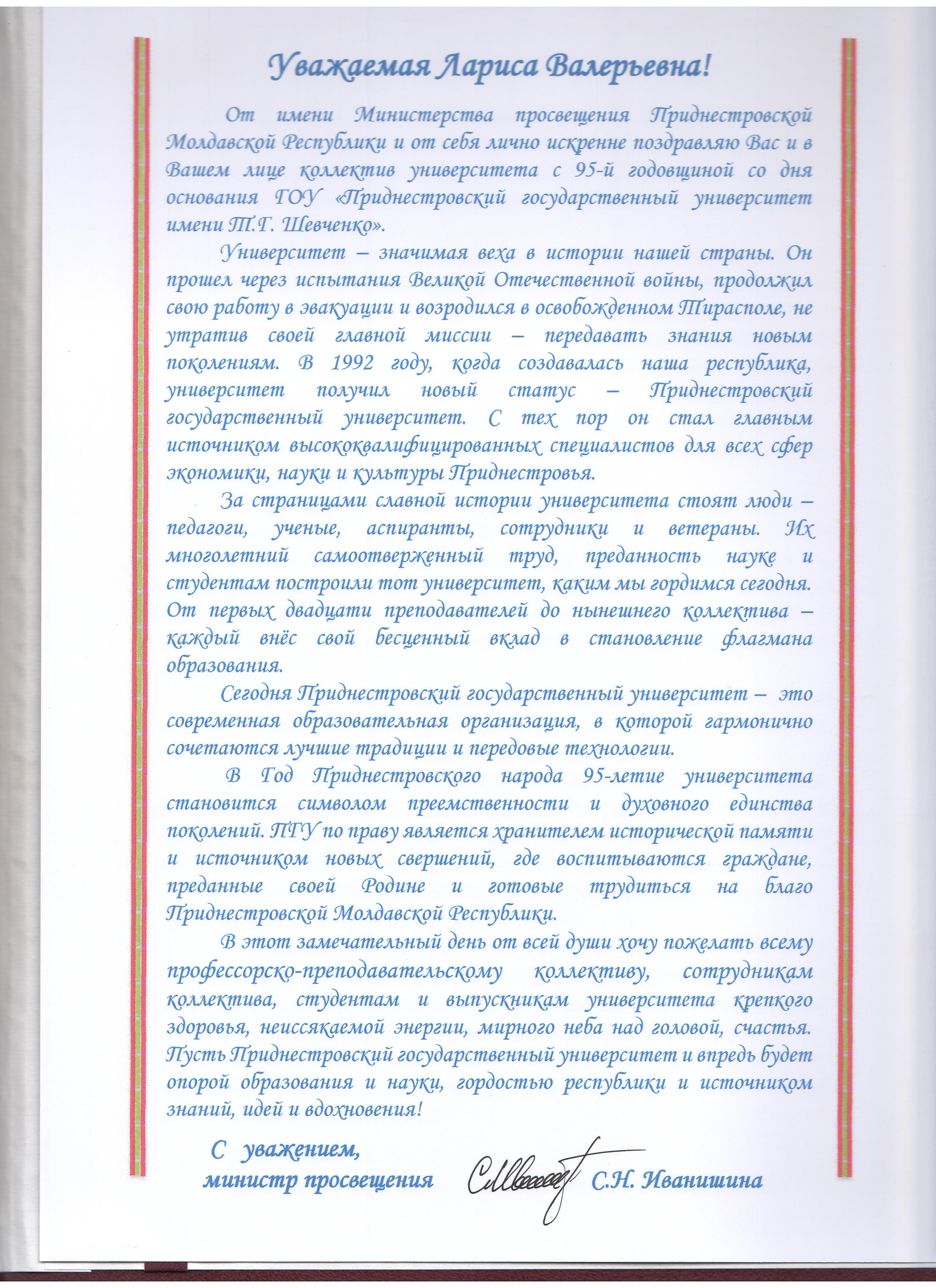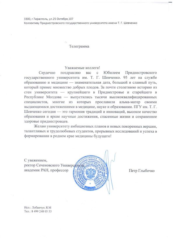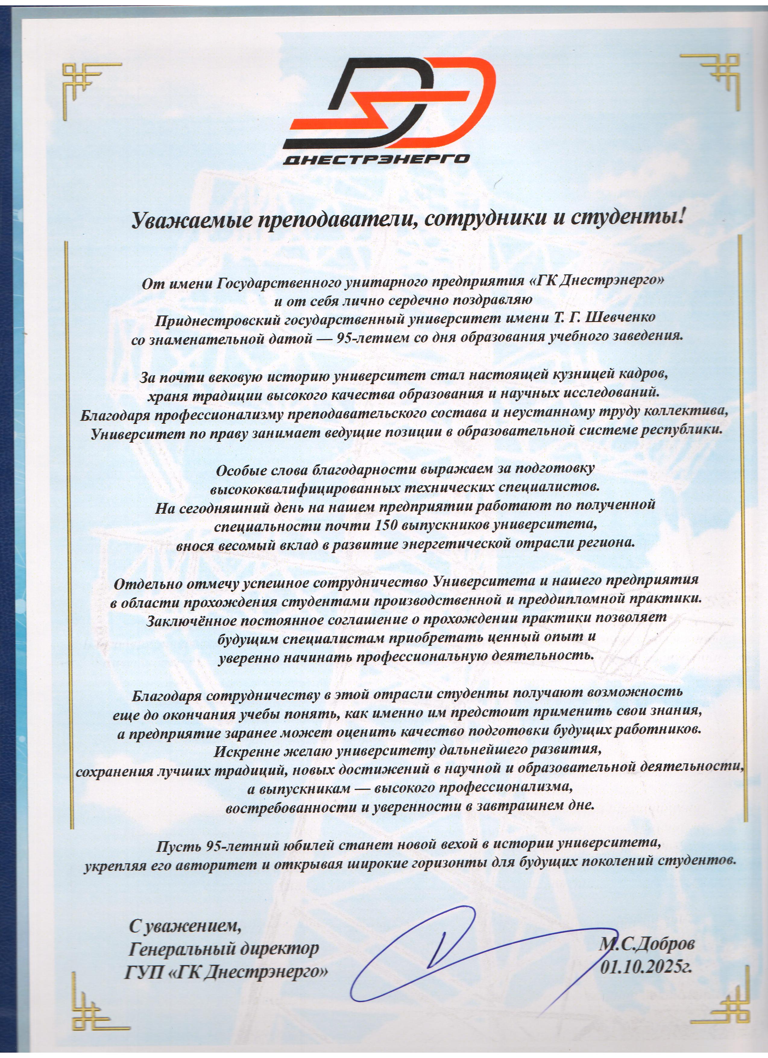В честь 95-летия Приднестровского государственного университета имени Т. Г. Шевченко в адрес вуза поступило множество поздравлений. Своё уважение и признательность выразили государственные структуры, образовательные и научные организации, партнёрские учреждения ближнего и дальнего зарубежья.