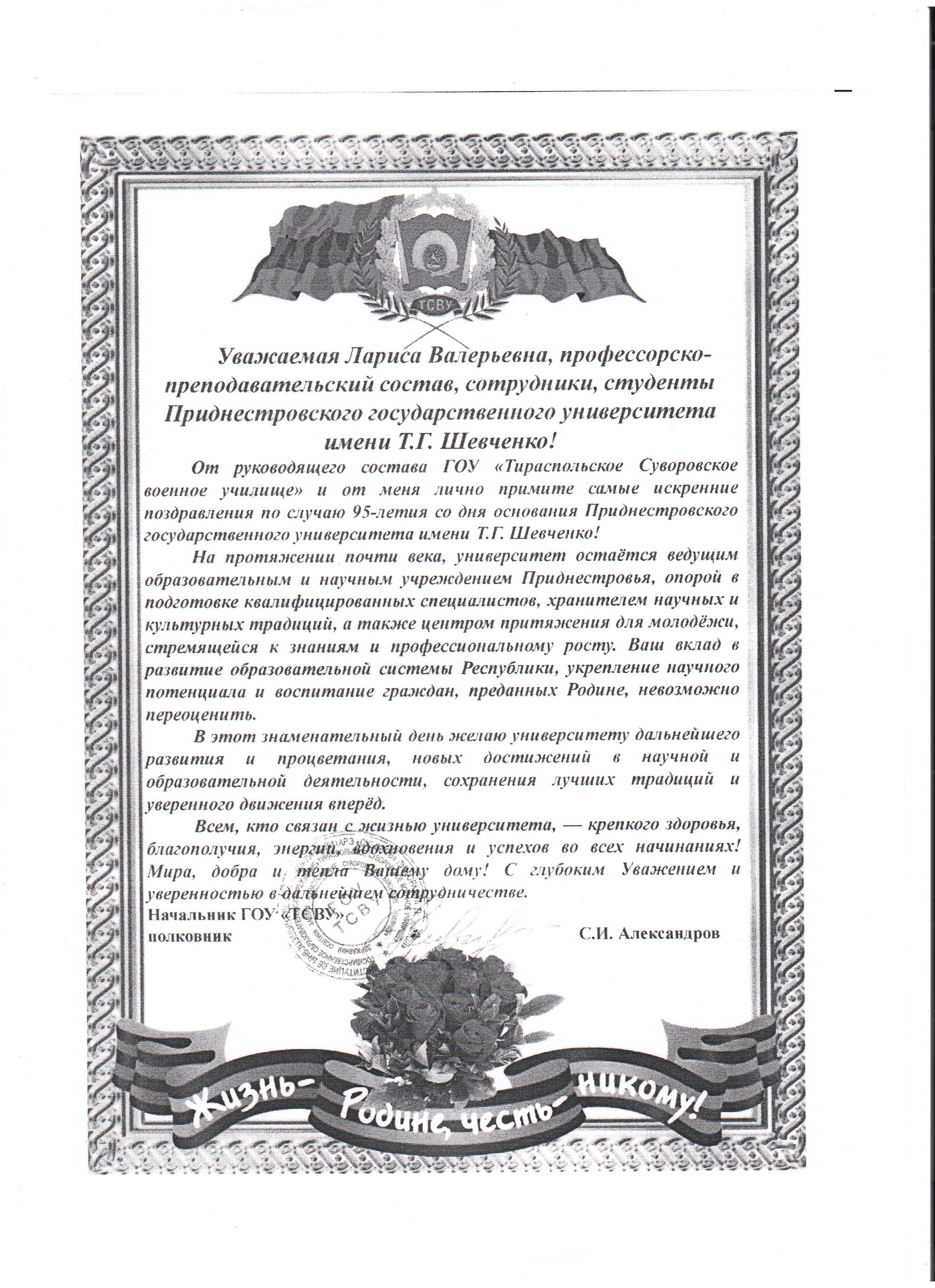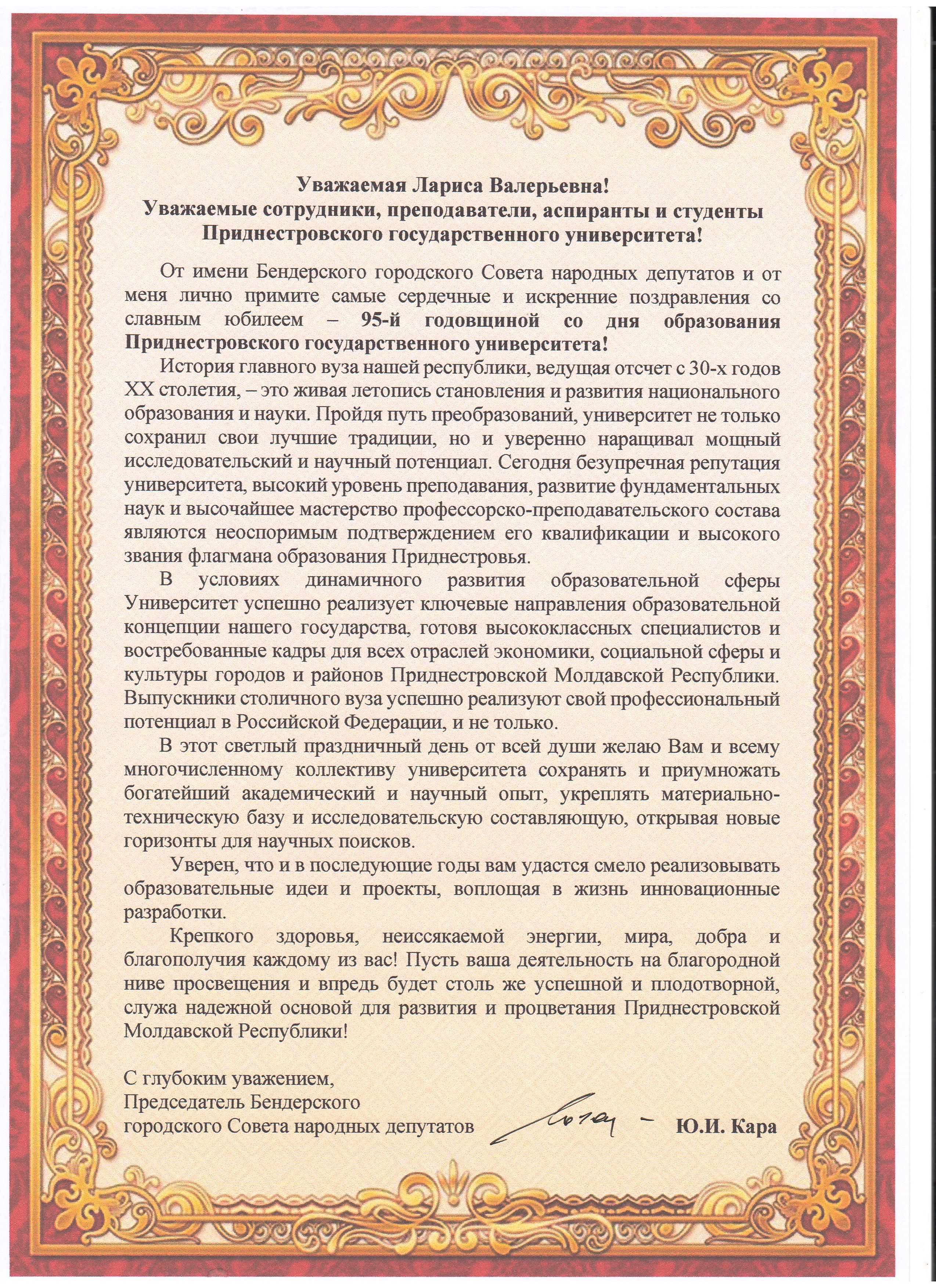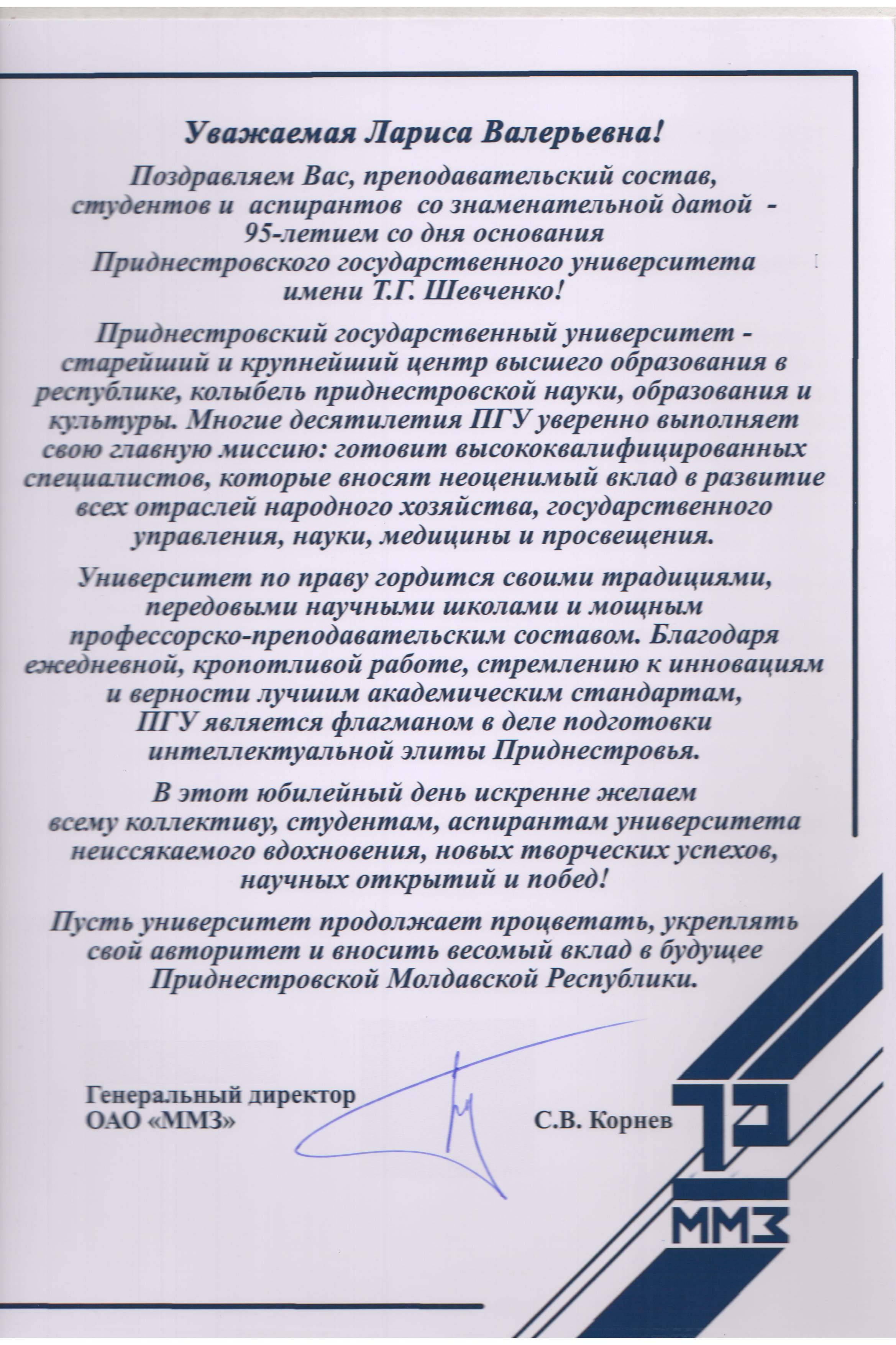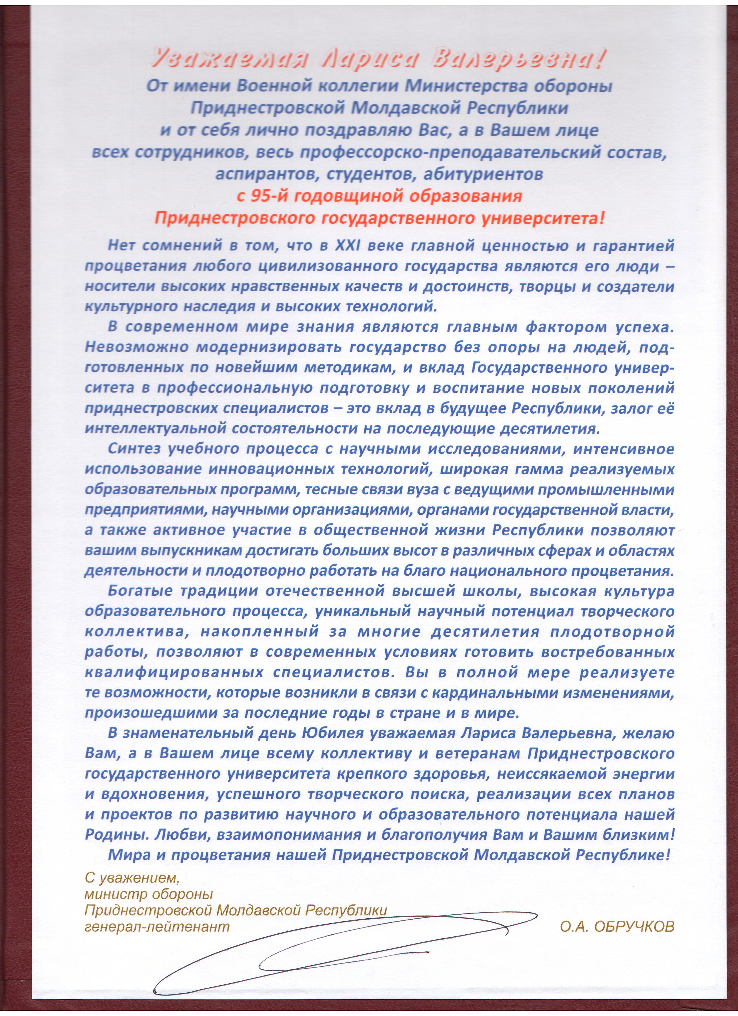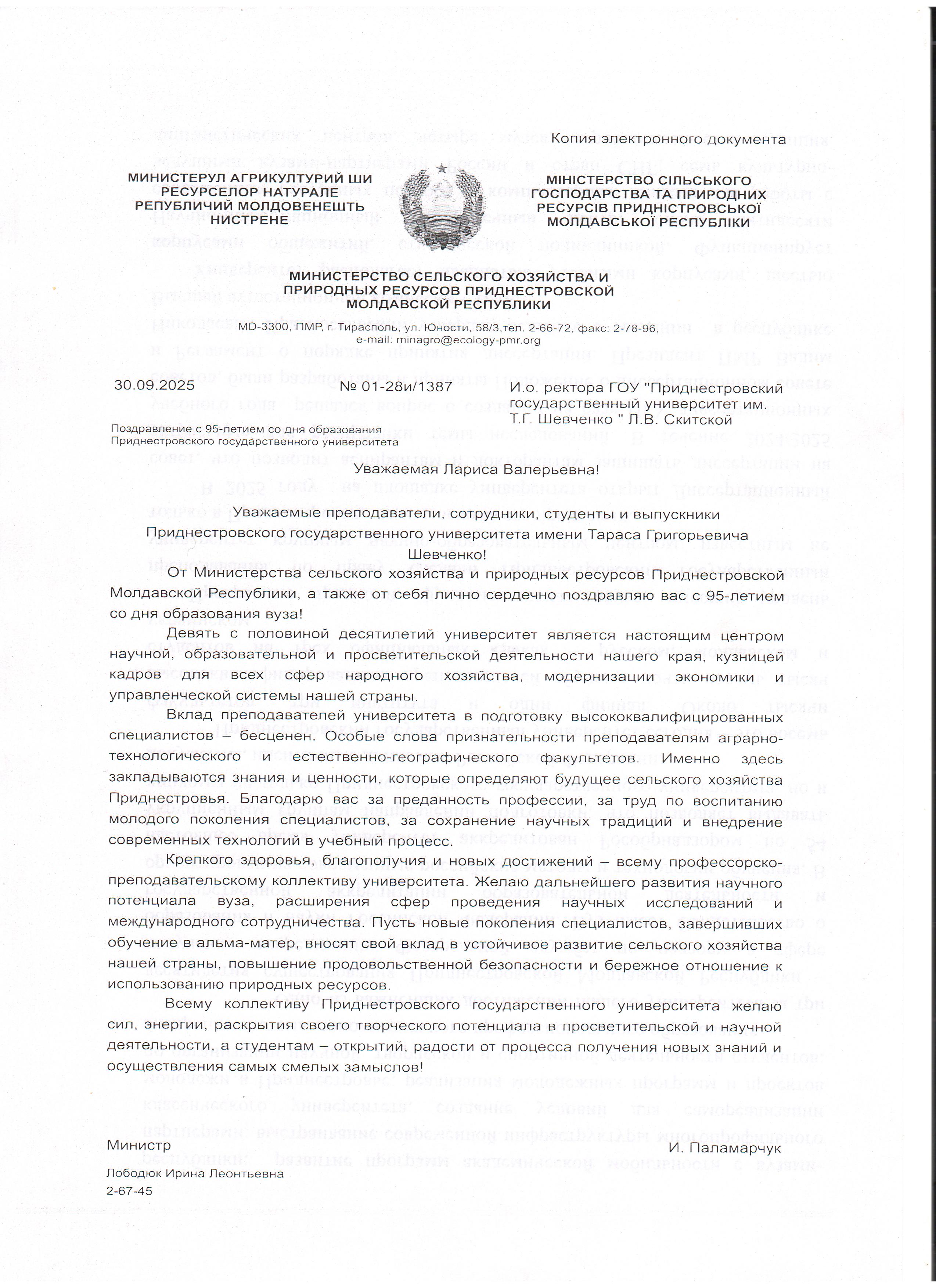 В честь 95-летия Приднестровского государственного университета имени Т. Г. Шевченко в адрес вуза поступило множество поздравлений. Своё уважение и признательность выразили государственные структуры, образовательные и научные организации, партнёрские учреждения ближнего и дальнего зарубежья.