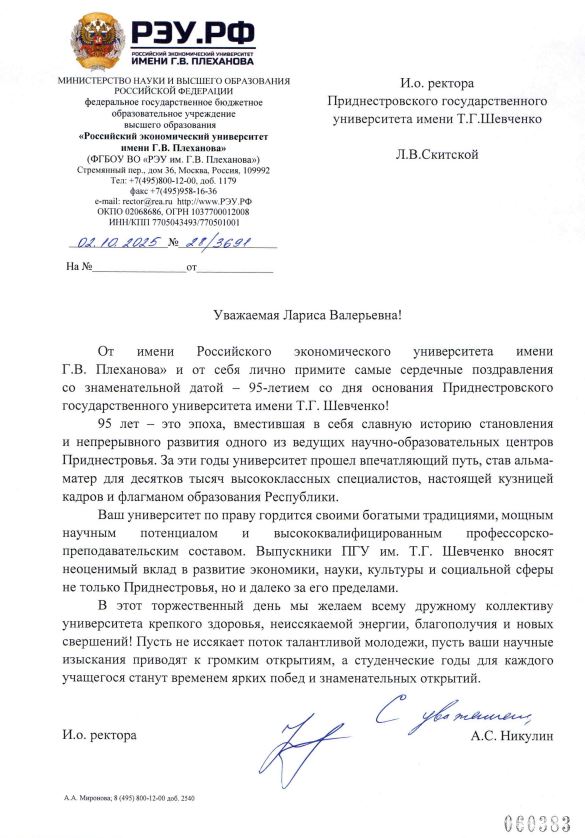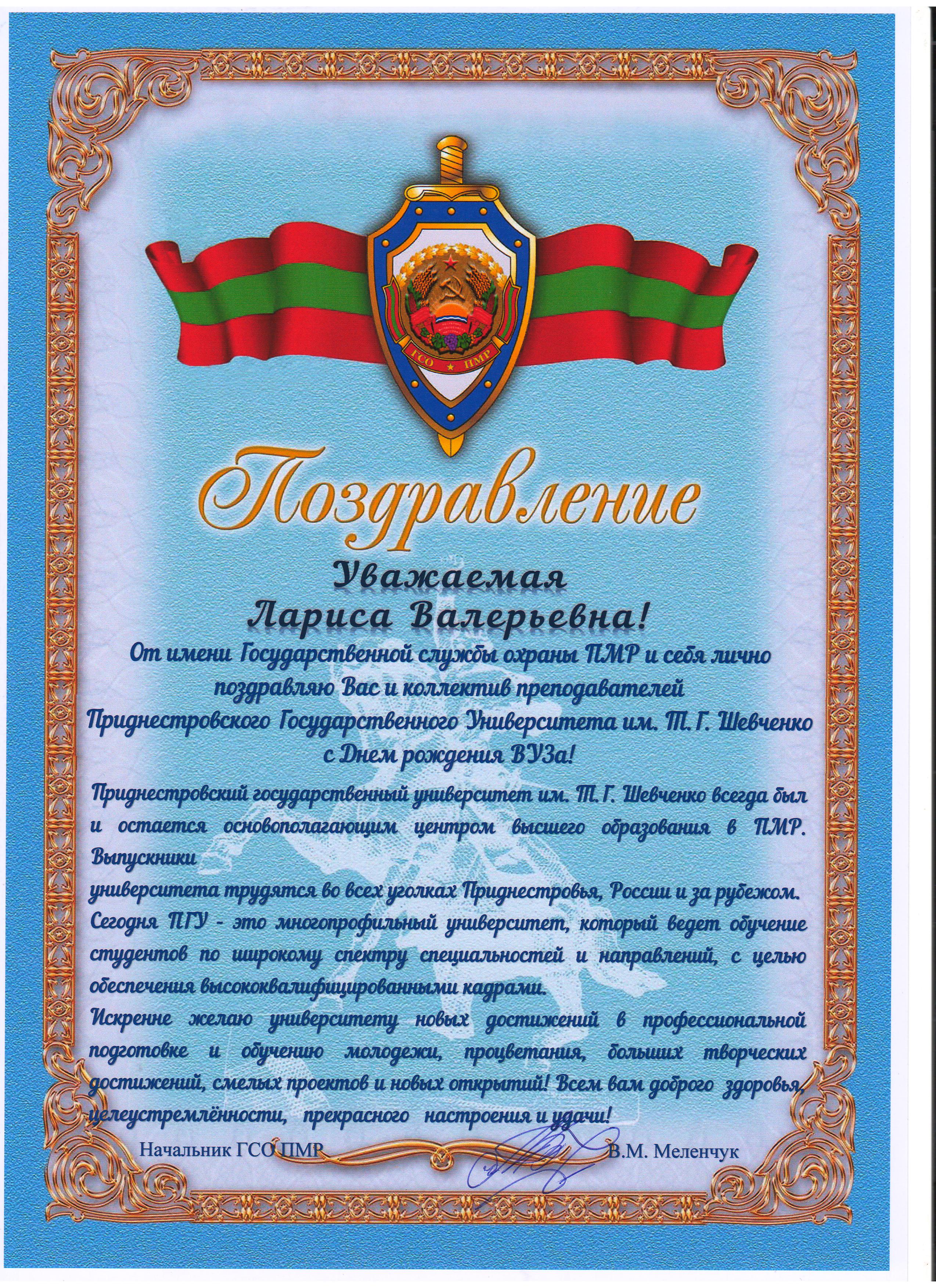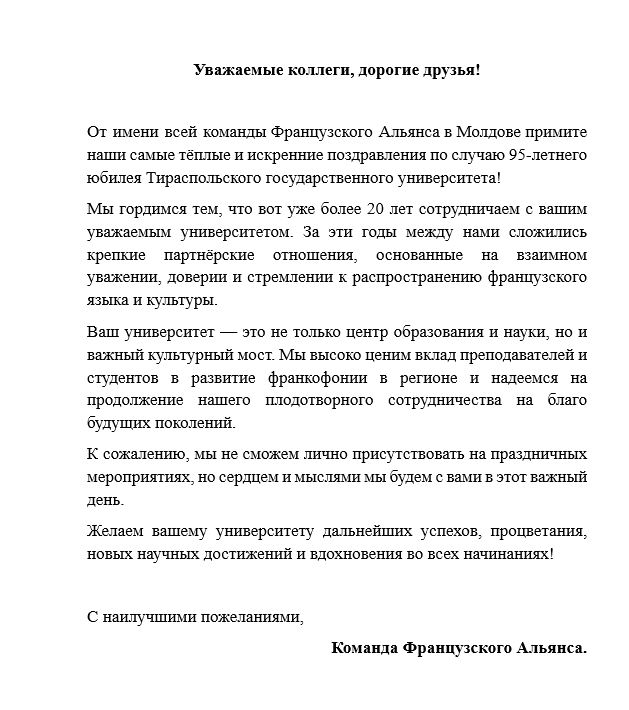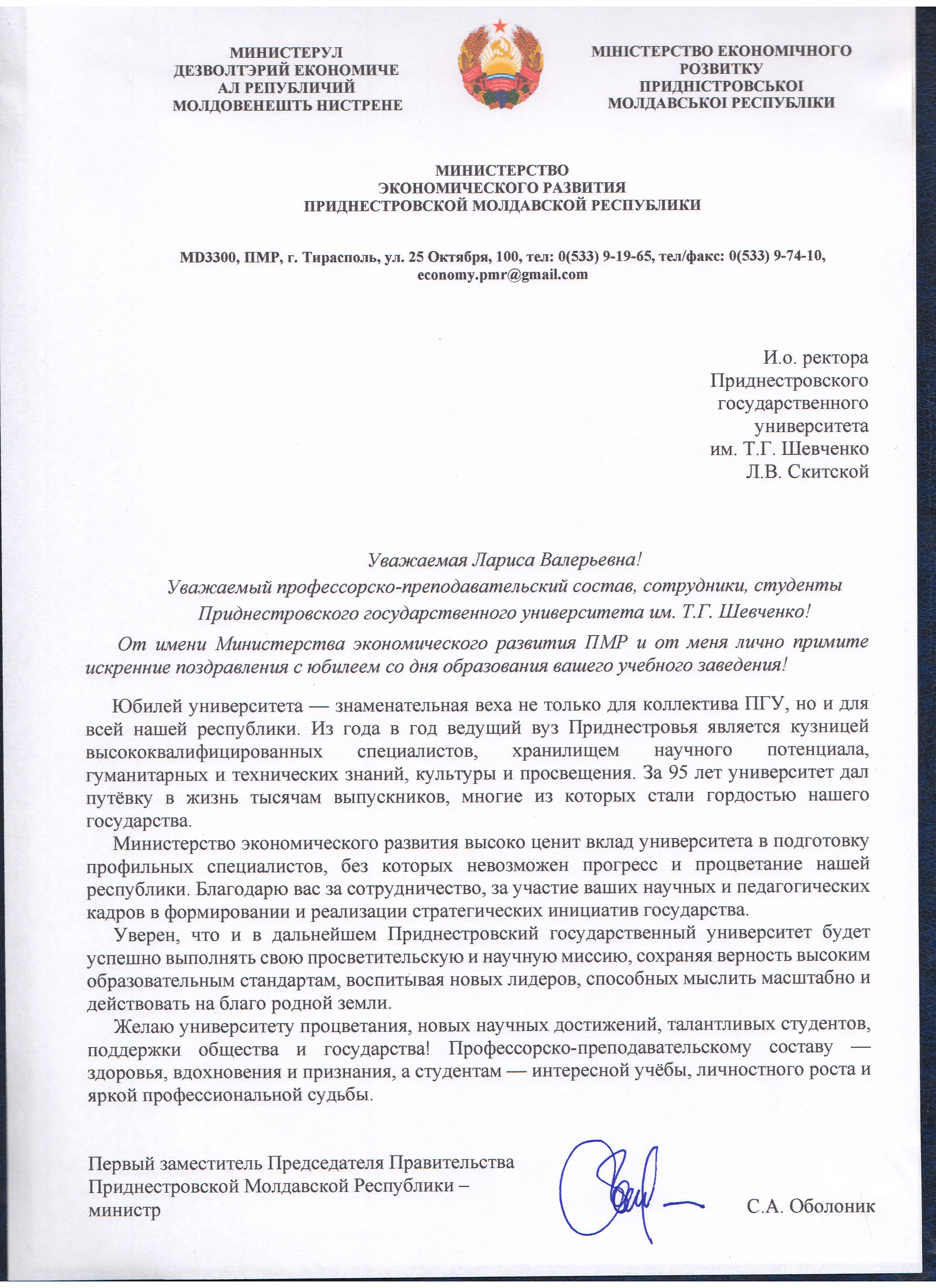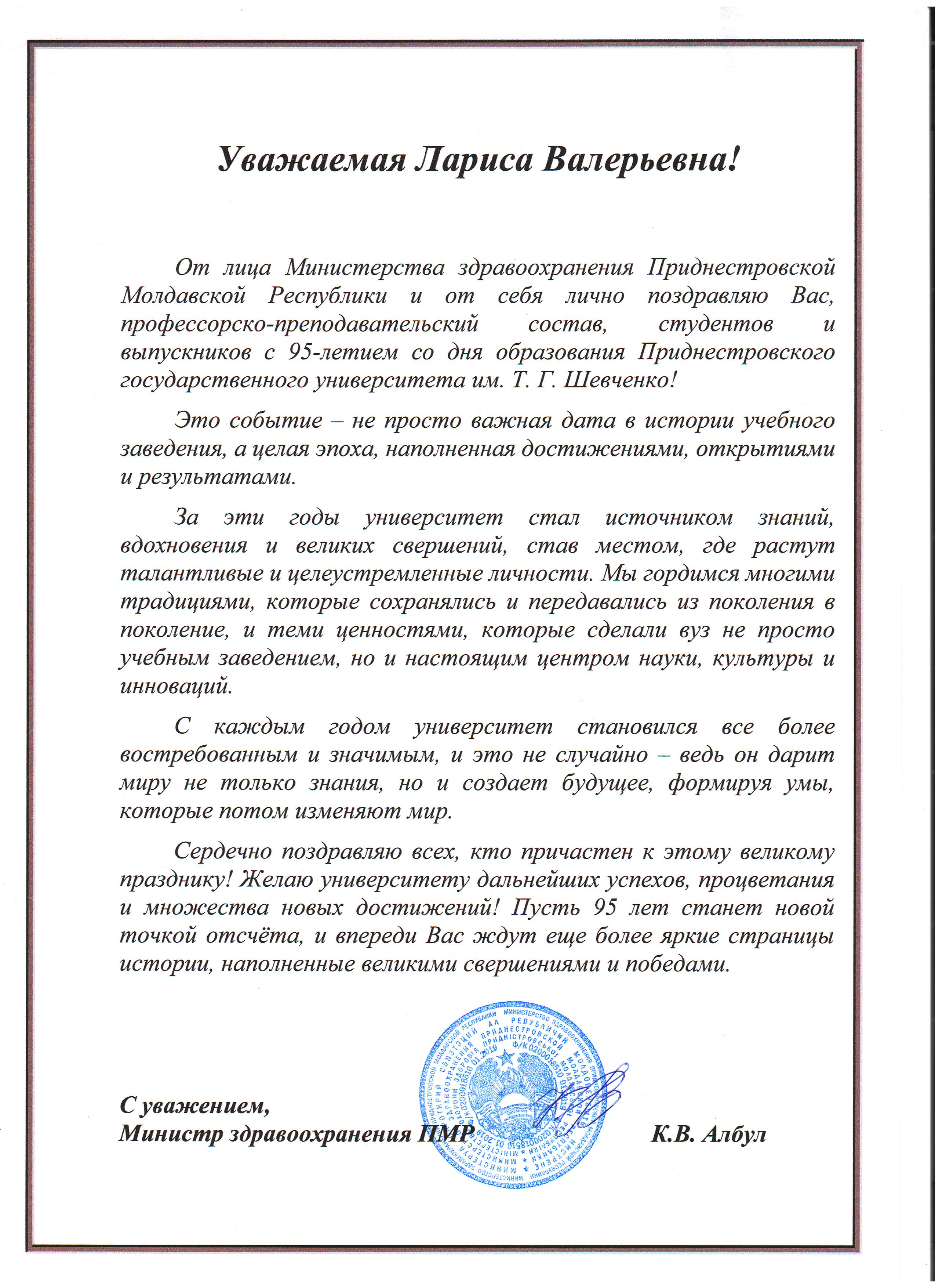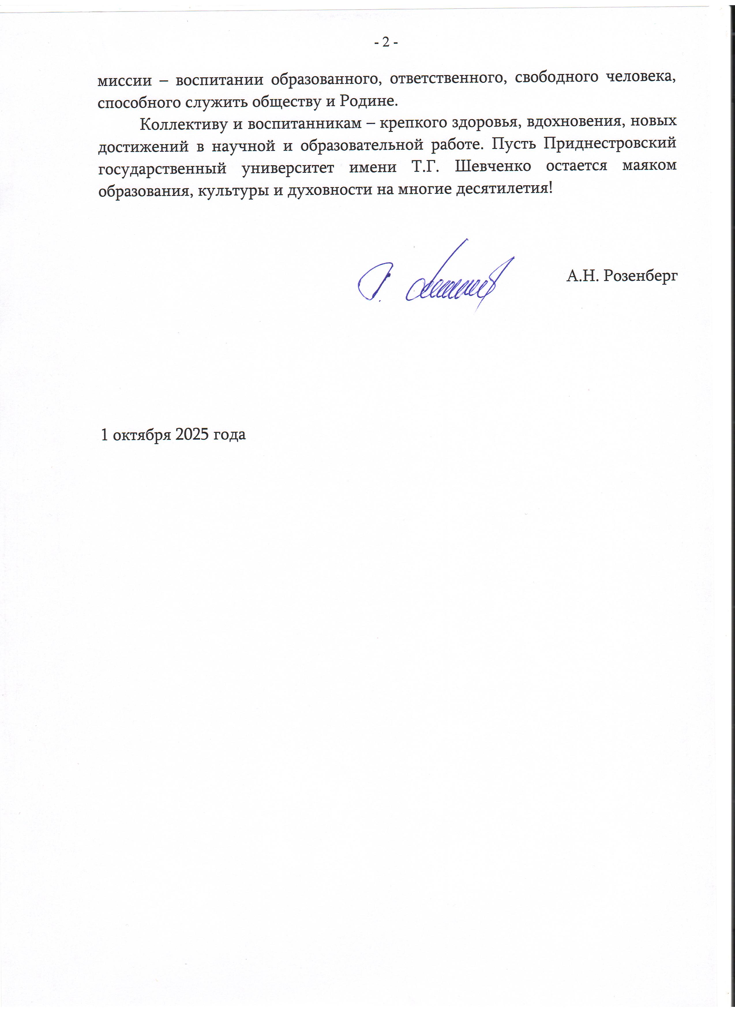 В честь 95-летия Приднестровского государственного университета имени Т. Г. Шевченко в адрес вуза поступило множество поздравлений. Своё уважение и признательность выразили государственные структуры, образовательные и научные организации, партнёрские учреждения ближнего и дальнего зарубежья.