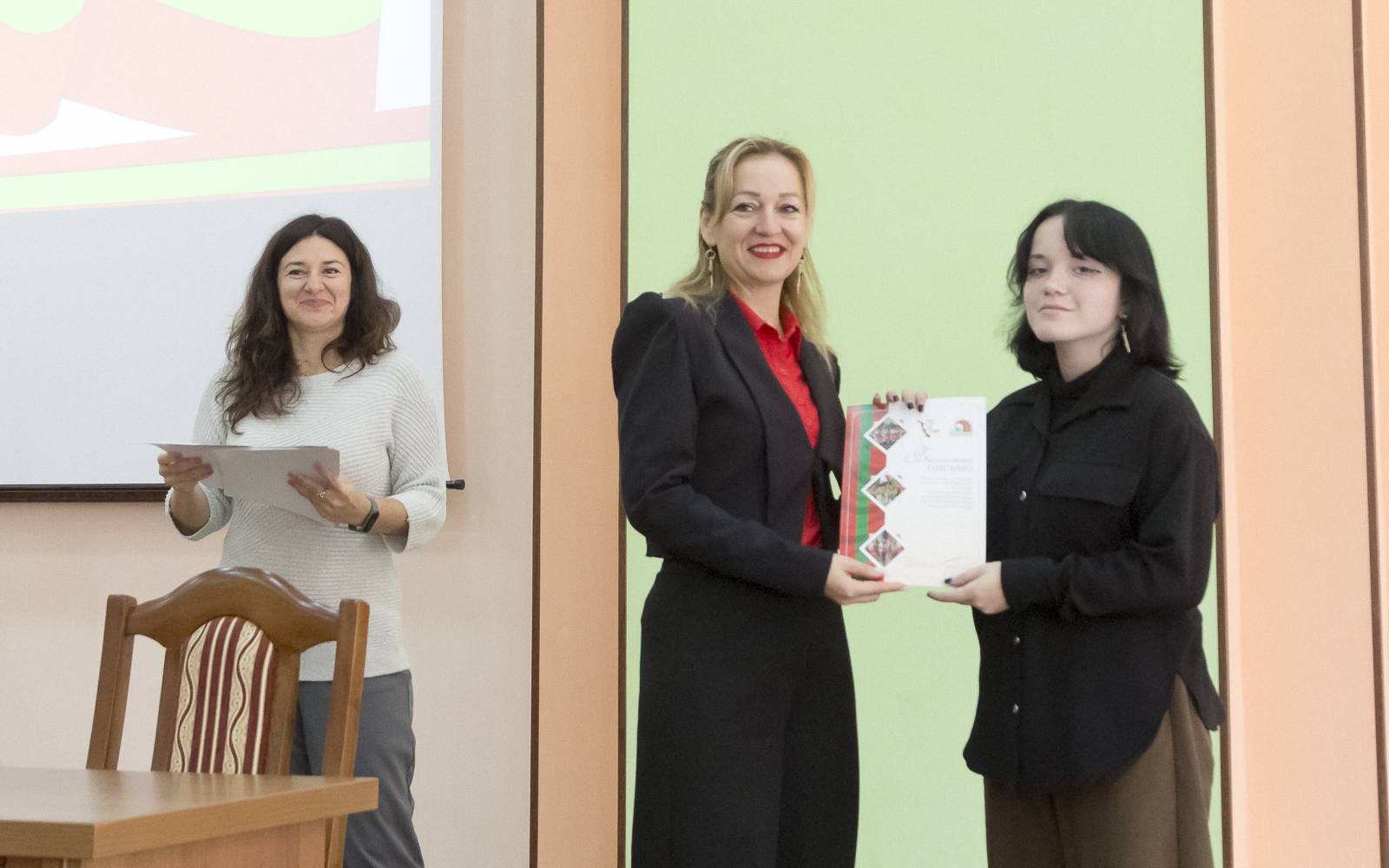 Для вручения благодарственных писем на сцену была приглашена начальник управления культуры, искусства, образования Государственной службы по культуре и историческому наследию ПМР Н.Ю. Аптер. «Хочется отметить, что данное награждение проходит по инициативе Президента ПМР В.Н. Красносельского, который дал самую высокую оценку нашей композиции. Роль студентов нашего университета в этом представлении велика – вы представляли творческую, активную, инициативную молодежь. Вы несли тему патриотизма», – подчеркнула Наталья Юрьевна.