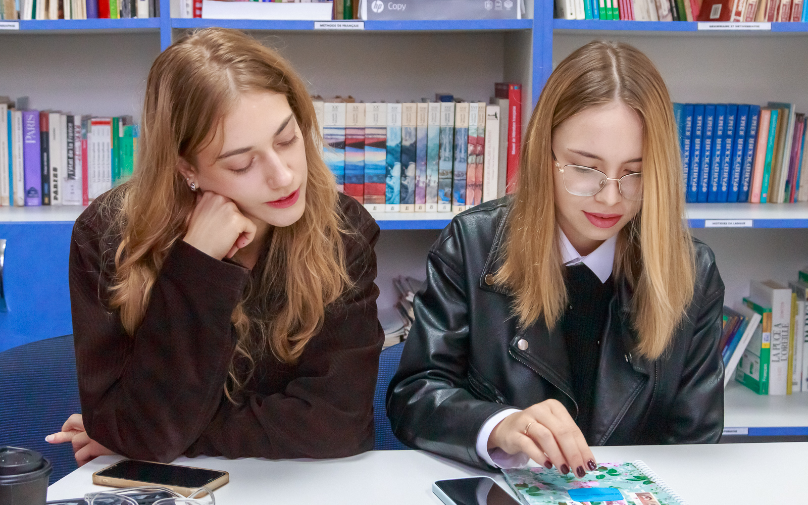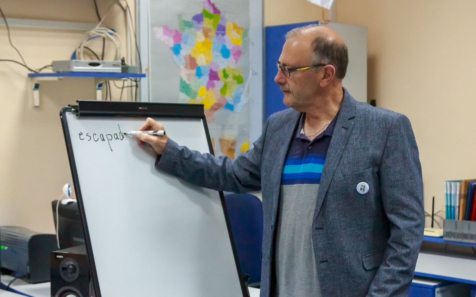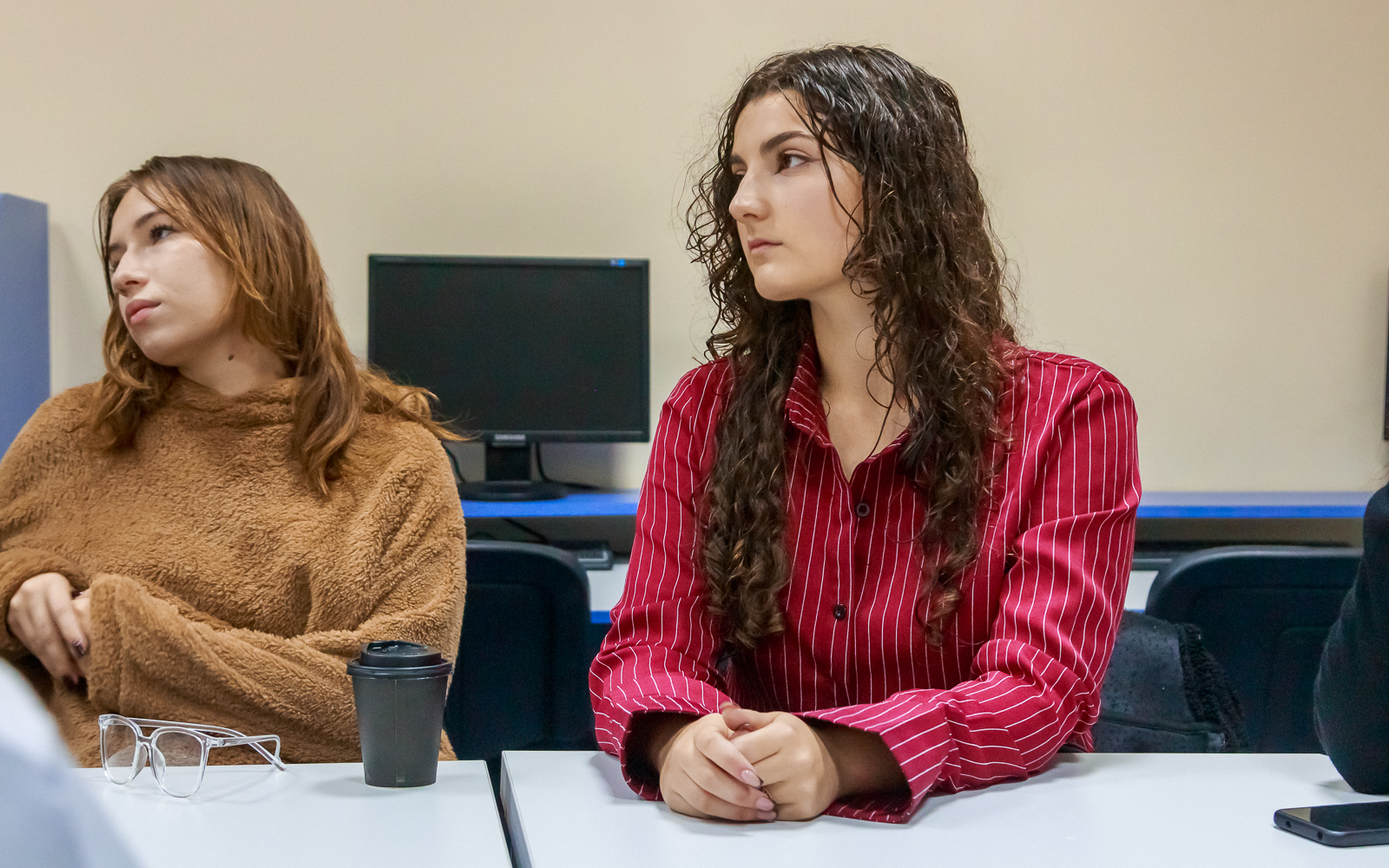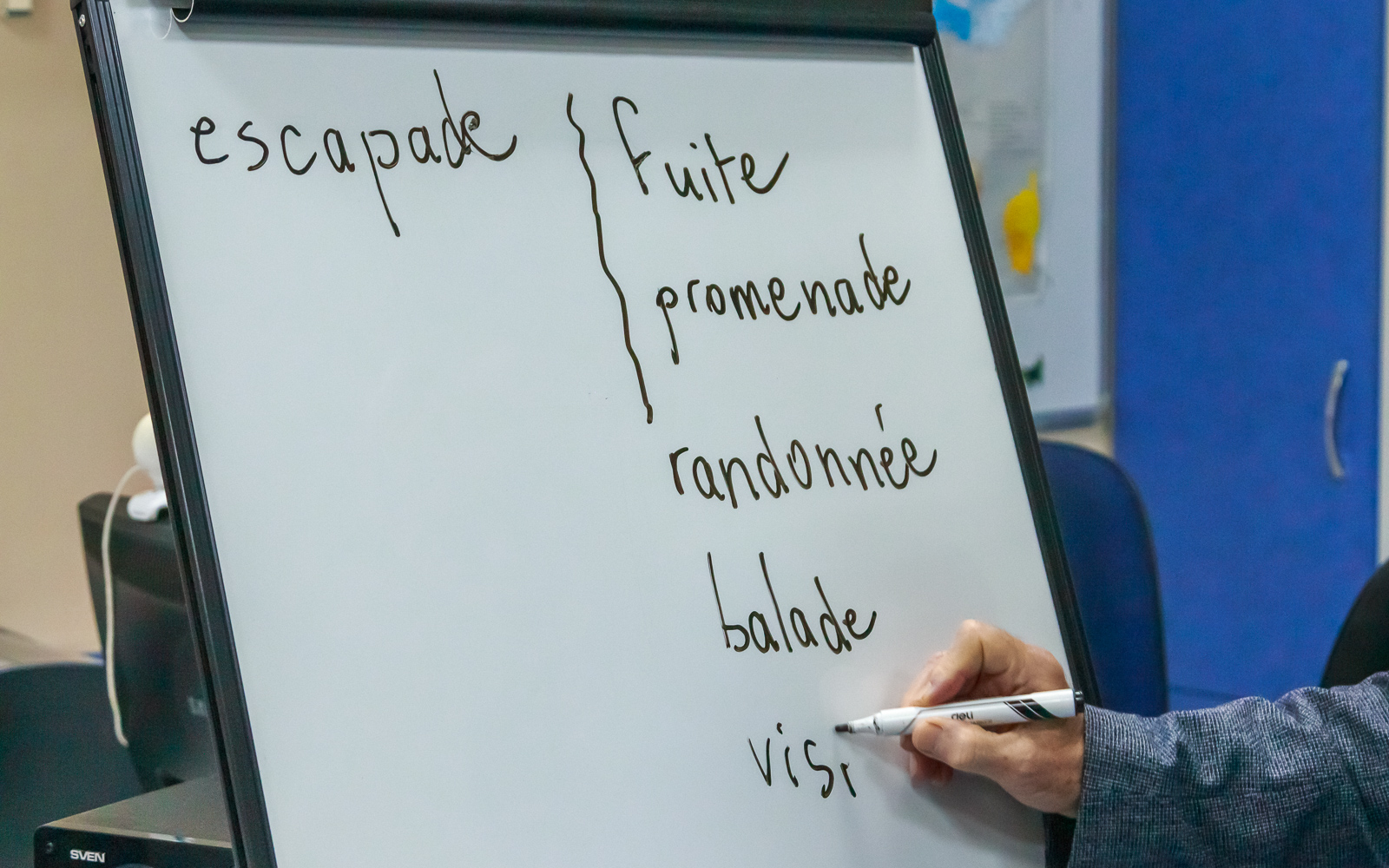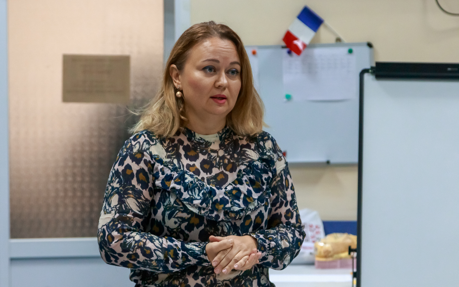 В это же время Коринн Жиарди провела тренинг со студентами. Ребята активно участвовали в интерактивных заданиях: читали и пытались перевести французские скороговорки, сопоставляли глаголы на тему кулинарии с картинками, пополняя словарный запас и тренируя произношение. Студенты также побеседовали с Коринн Жиарди на тему стереотипов, когда пытались по фото определить профессию человека. В конце ребят ждала интересная презентация о французских сырах.