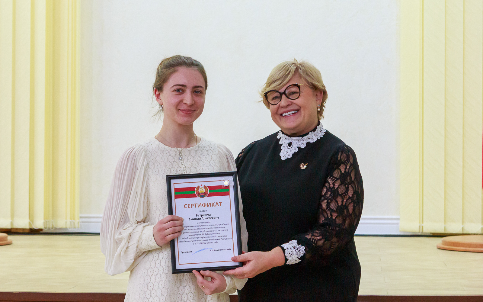 От имени президентских стипендиатов этого учебного года со словами благодарности выступила студентка Приднестровского государственного института искусств им. А.Г. Рубинштейна Богдана Ясинская. «Для нас эта стипендия не просто поощрение, а важный знак, что наши старания замечены, наши достижения оценены. Это не только мотивация, но и напоминание о том, что мы – будущее своей страны», – сказала Богдана, добавив, что такая поддержка даёт силы двигаться дальше, несмотря на то, что на пути много трудностей и преград. Девушка также в знак благодарности исполнила песню «Тысячи дорог» Виктории Черенцовой.
