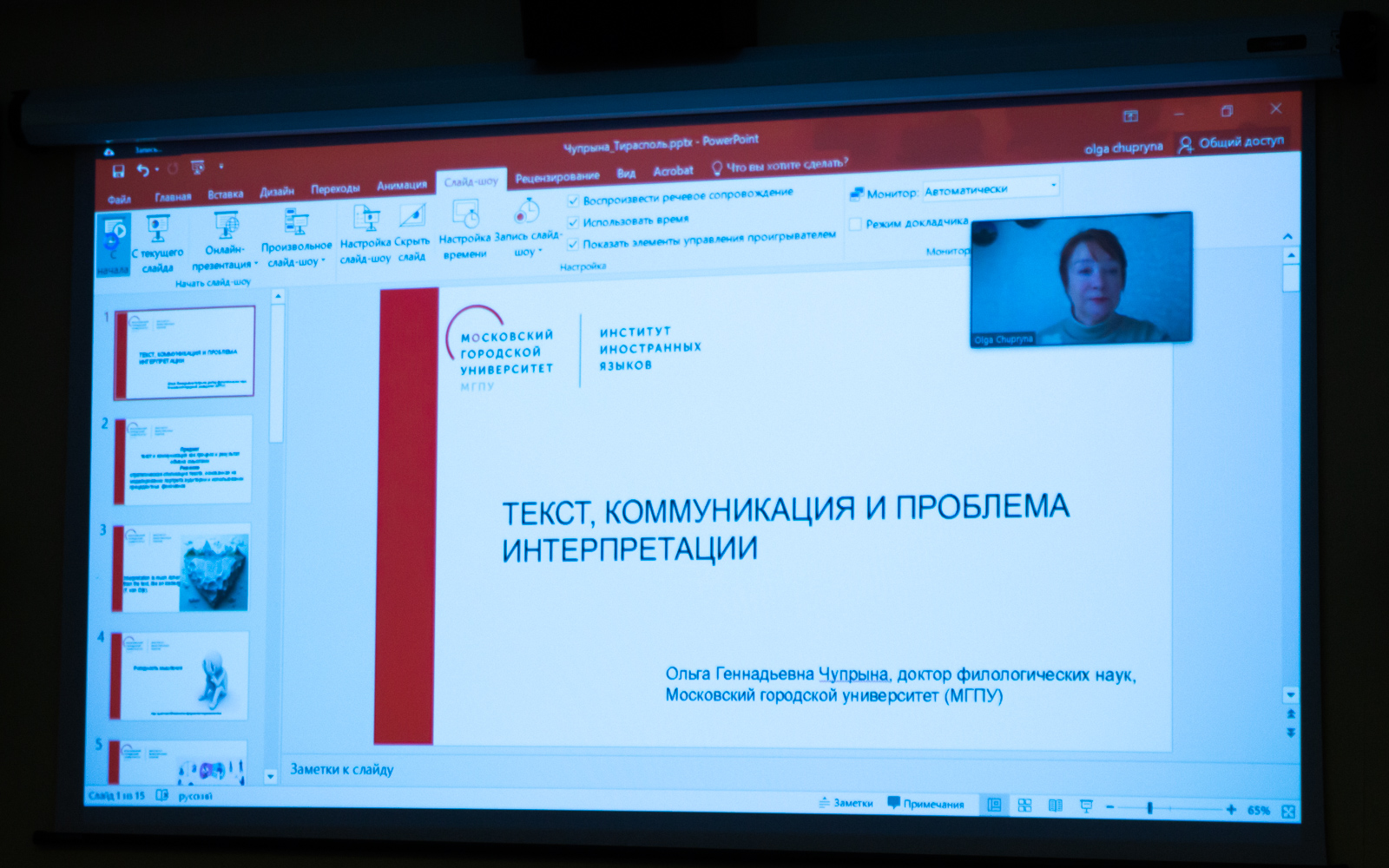 Выступившая с докладом «Текст, коммуникация и проблема интерпретации» доктор филологических наук, профессор МГПУ О.Г. Чупрына подчеркнула, что текст является не только формой, но и инструментом коммуникации, а процесс его понимания зависит от ментальных моделей восприятия и когнитивных особенностей адресата. Негибкость мышления и устойчивые стереотипы мешают адекватной интерпретации, тогда как стилизация текста помогает установить доверительный контакт между автором и аудиторией.