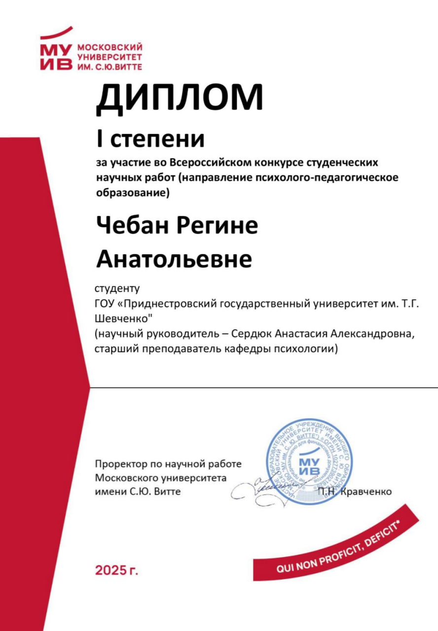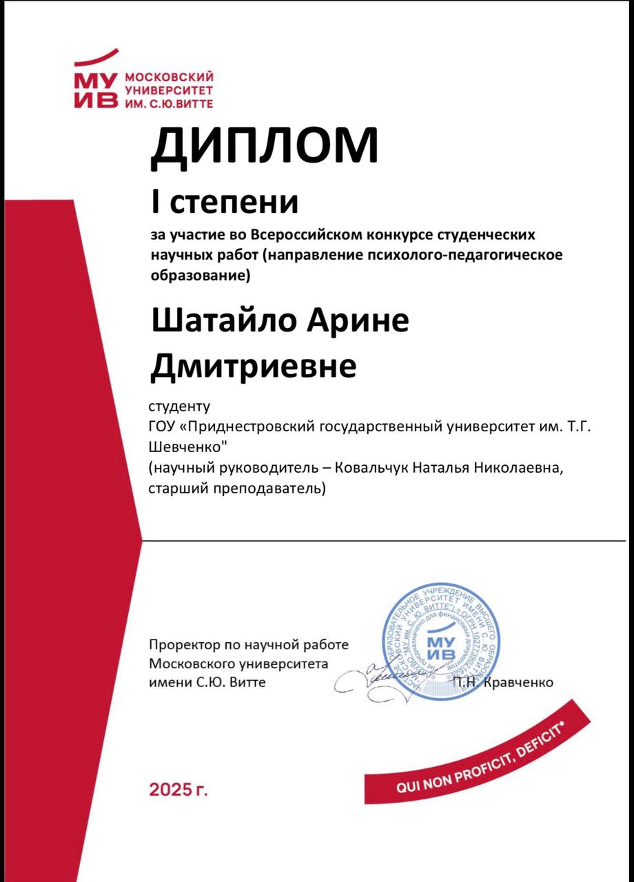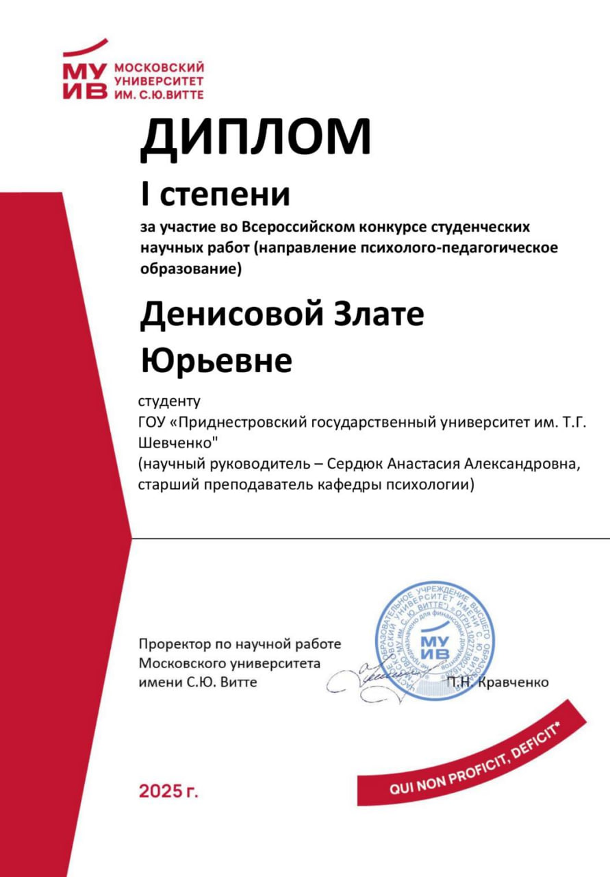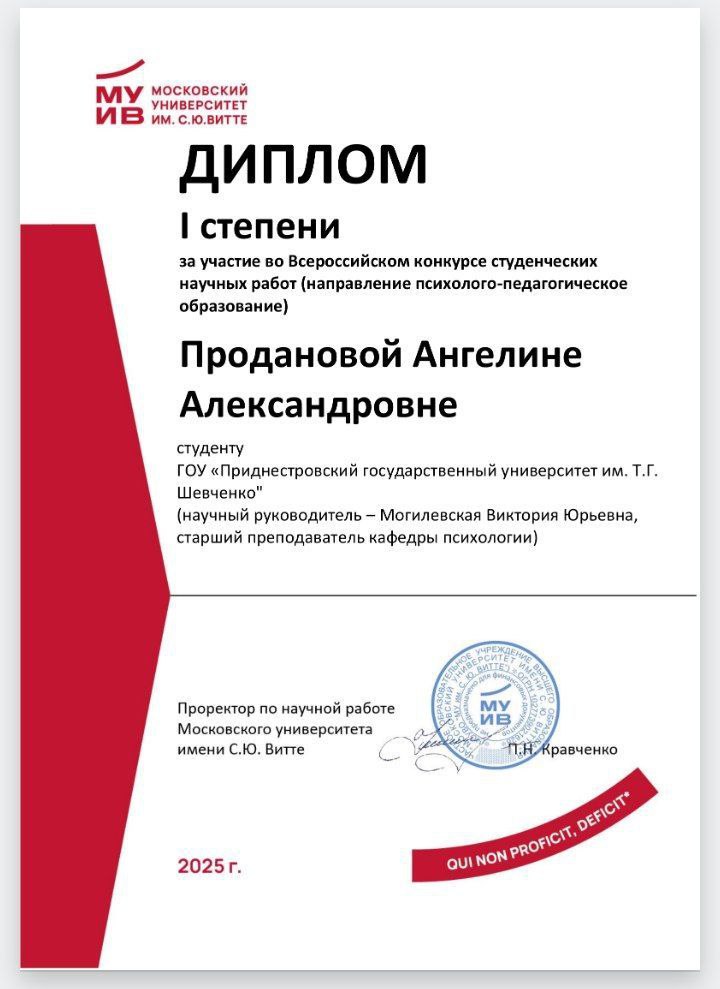 Дипломантами I степени всероссийского межвузовского конкурса на лучшую студенческую научную работу по психологии по направлению «Психолого-педагогическое образование» стали студенты разный курсов и профилей обучения «Психология образования» и «Прикладная психология»: Ангелина Проданова, Анастасия Колыжук, Валерия Буторина (научный руководитель ст. преподаватель В.Ю. Могилевская); Арина Шатайло (научный руководитель ст. преподаватель Н.Н. Ковальчук); Регина Чебан, Злата Денисова (научный руководитель ст. преподаватель А.А. Сердюк); Анастасия Жумара (научный руководитель преподаватель А.С. Комарова).