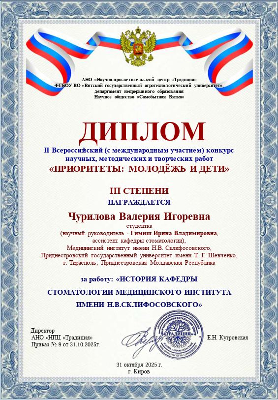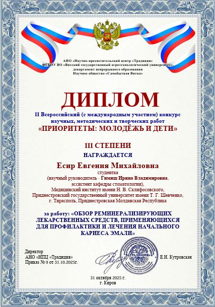 По итогам оценки конкурсной комиссии дипломантами III степени стали студентка V курса Евгения Есир и студентка I курса Валерия Чурилова. Научный руководитель –ассистент кафедры стоматологии Ирина Владимировна Гимиш.