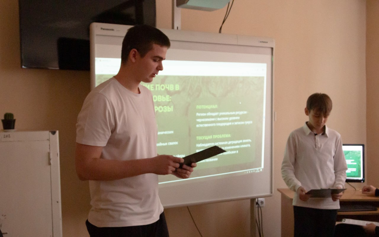 Учащиеся Тираспольской СШ №8 Дарья и Кирилл Капитальчук подготовили докладна тему «Плодородие и деградация почв Приднестровья», описали динамику изменений почв, подчеркнув важность гумуса, структуры и влагоемкости, а также необходимость сочетания агротехнических, мелиоративных и экологических мероприятий для предотвращения деградации.