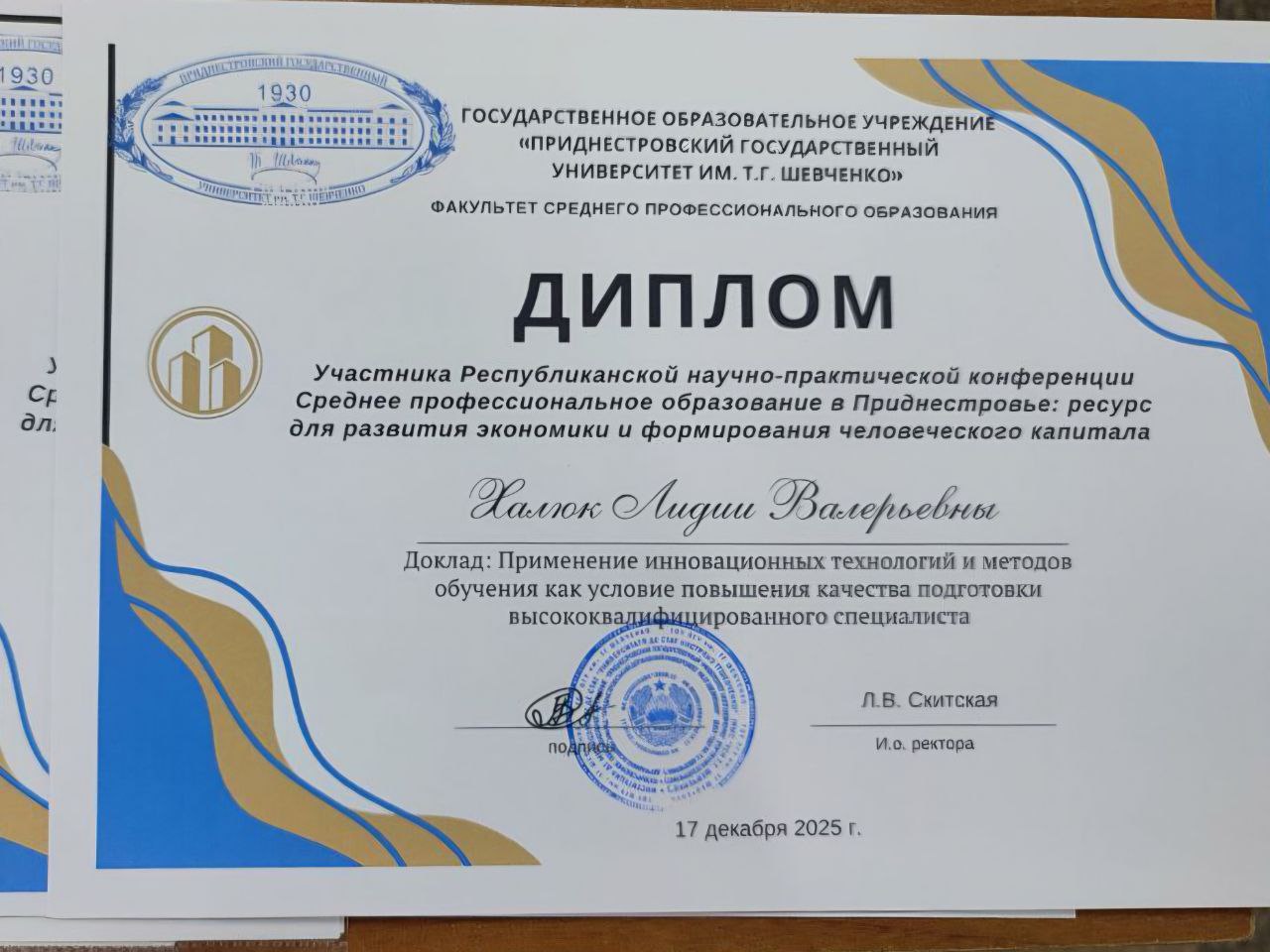 Преподаватель и педагог-психолог Приднестровского колледжа технологий и управления Лидия Валерьевна Халюк в своем докладе «Применение инновационных технологий и методов обучения как условие повышения качества подготовки высококвалифицированного специалиста» акцентировала внимание на значении активных и интерактивных методов обучения, психолого-педагогического сопровождения студентов и формировании профессиональных компетенций.
