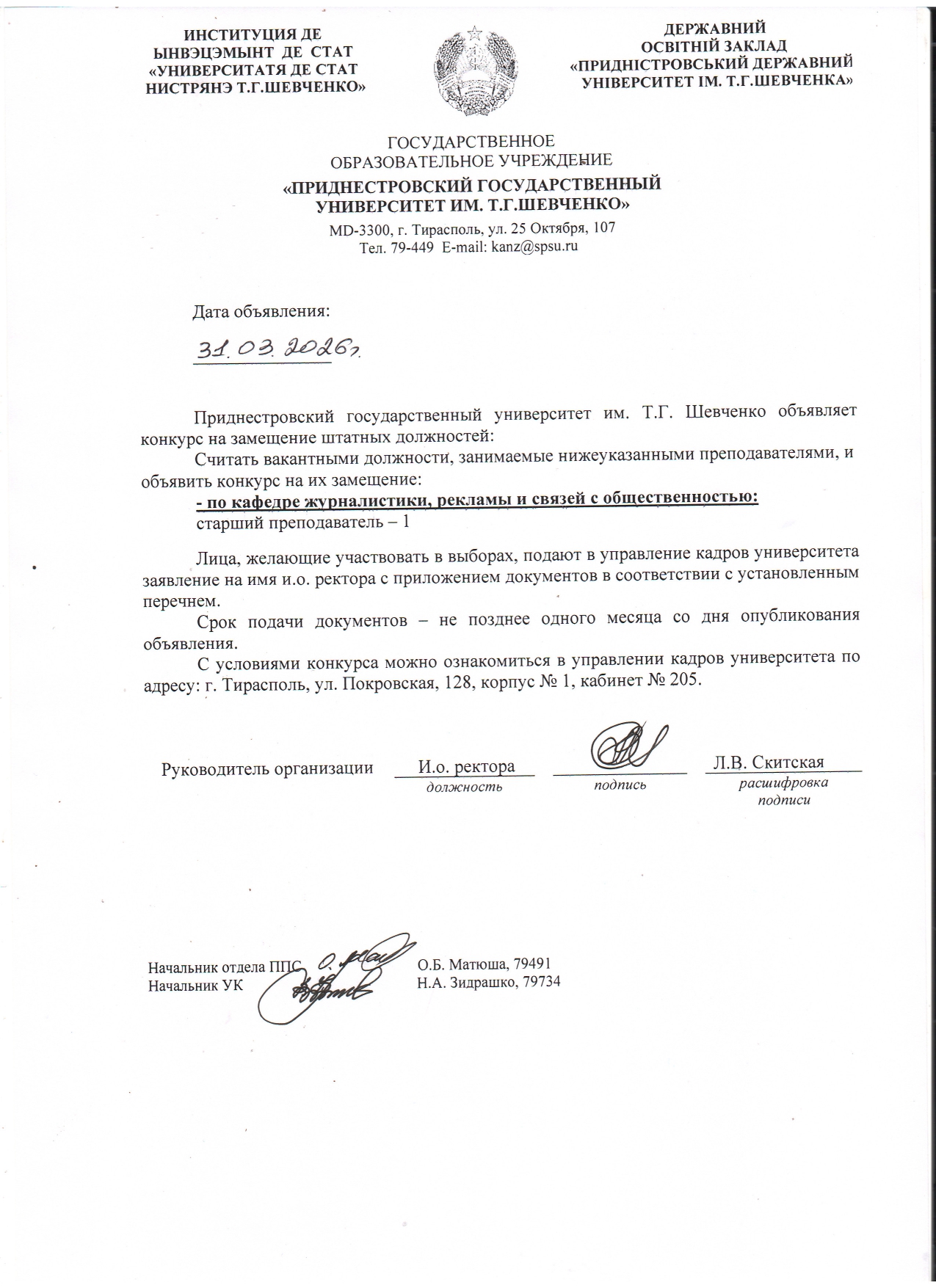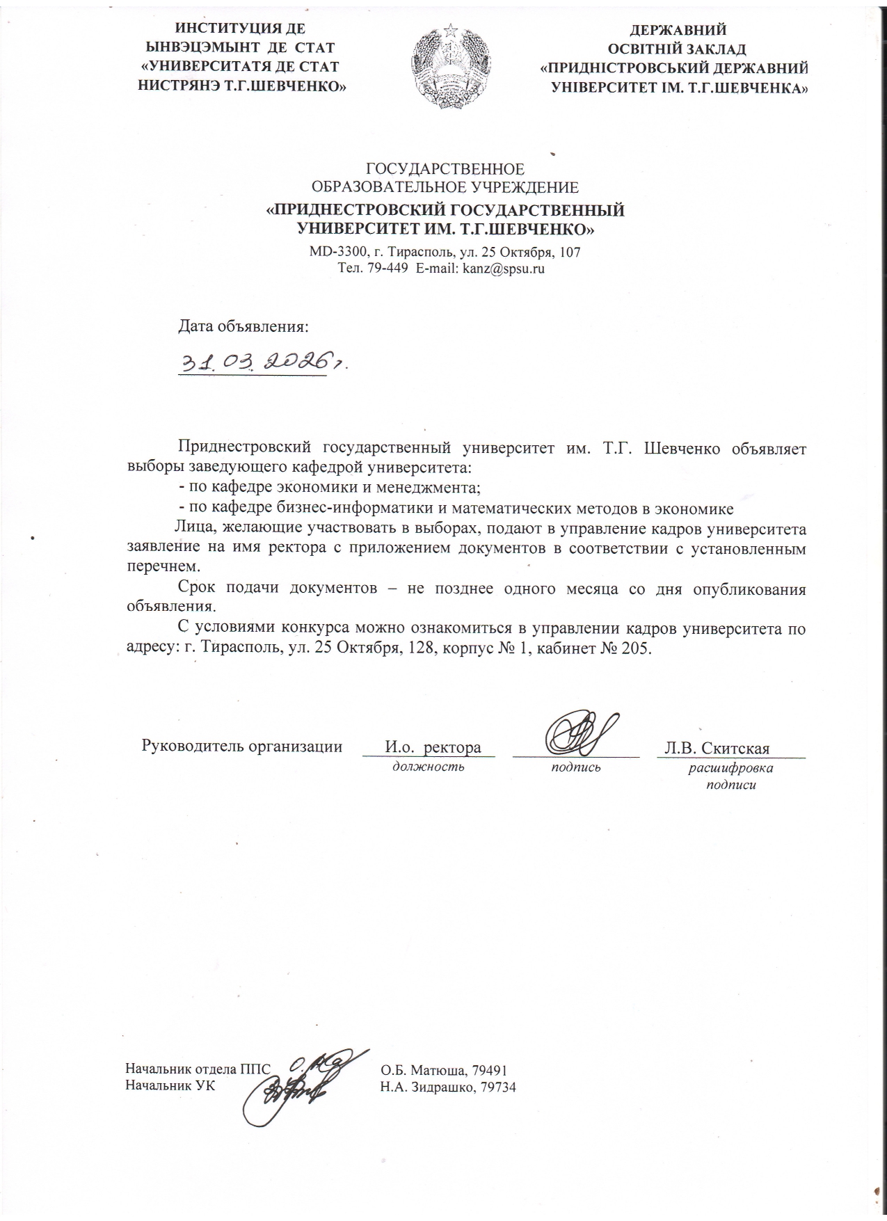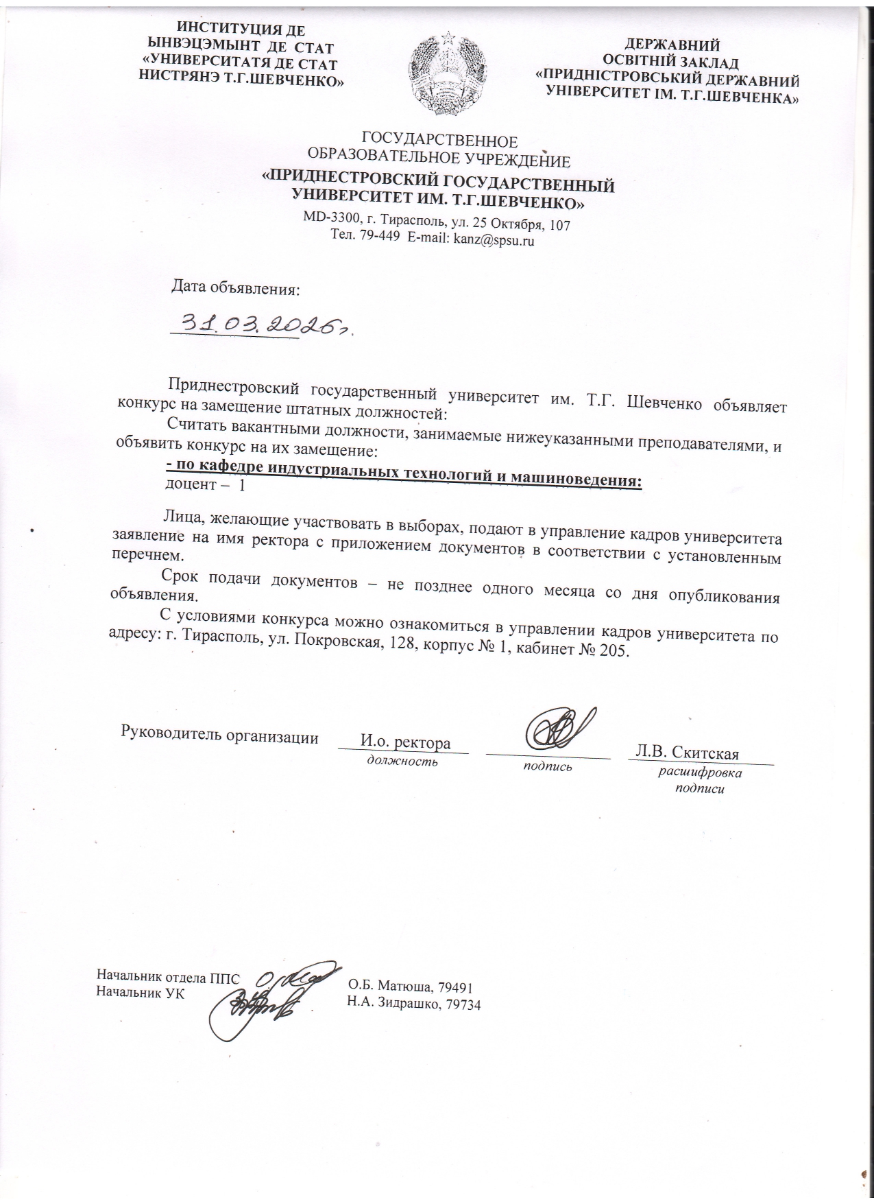 и.о. ректора ГОУ «ПГУ им. Т.Г. Шевченко»,
