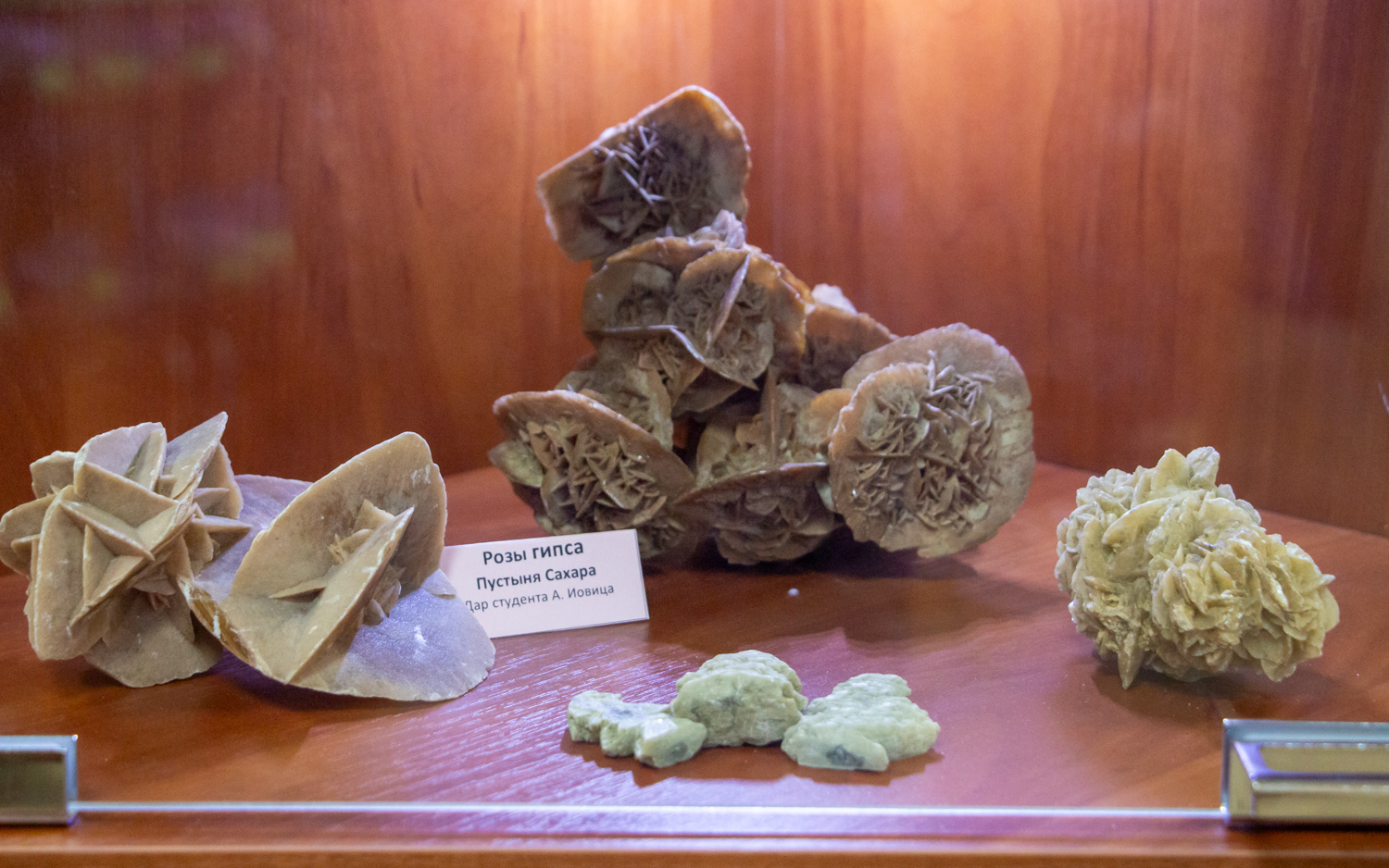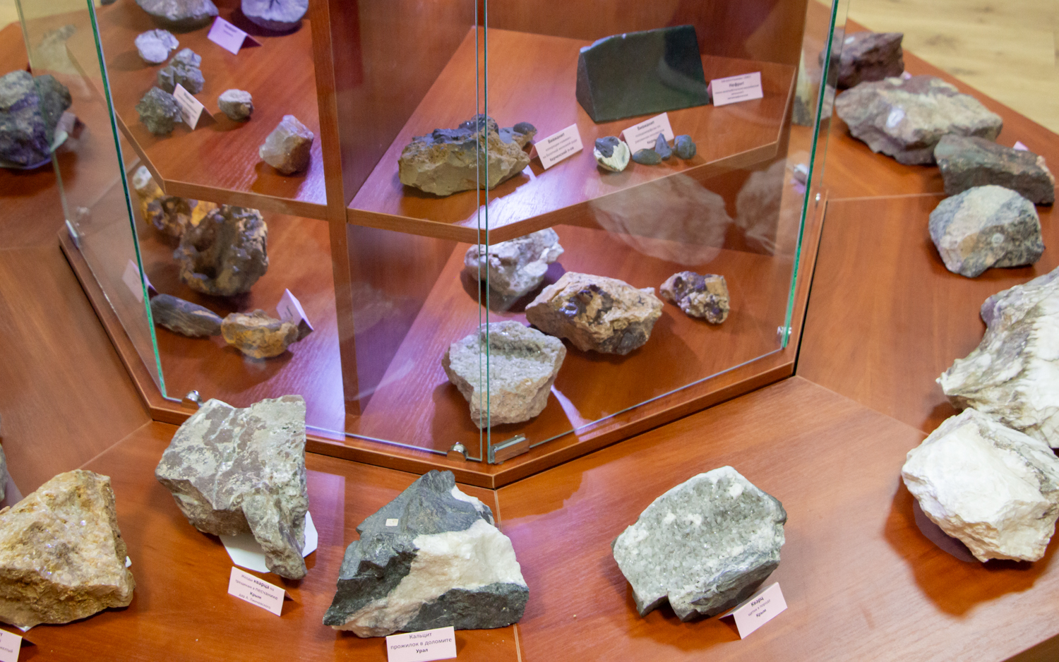 В экспозиции представлены разнообразные образцы минералов. Среди окислов кремнезёма — горный хрусталь, аметист, морион, различные разновидности кварца, халцедон, агат и опал. В группе силикатов экспонируются гранаты, эвдиалиты, топазы, турмалины (рубелит и верделит), родонит, нефрит, лазурит, амазонит, лабрадор, лунный камень, хризоколла. Также в коллекции представлены кристаллы пирита и других минералов. Фонды музея регулярно пополняются: в разные годы сюда поступили образцы необработанного янтаря, переданные МГБ ПМР; отшлифованные срезы поделочных камней и образец керна Кольской сверхглубокой скважины, предоставленные Л.Ф. Романовым; полированные аншлифы руд и шлифы основных типов горных пород, переданные профессором Одесского университета В.Н. Кадуриным; шлихи пород из кимберлитов Якутии, переданные Ю.Г. Беляевым. Существенный вклад в пополнение коллекции внесли А.В. Кривенко и В.Г. Фоменко, передавшие образцы из Крыма и зарубежных месторождений. Отдельную группу составляют дары студентов, включая друзы кварца и аметиста, а также гипсовые «розы» из пустыни Сахара.
