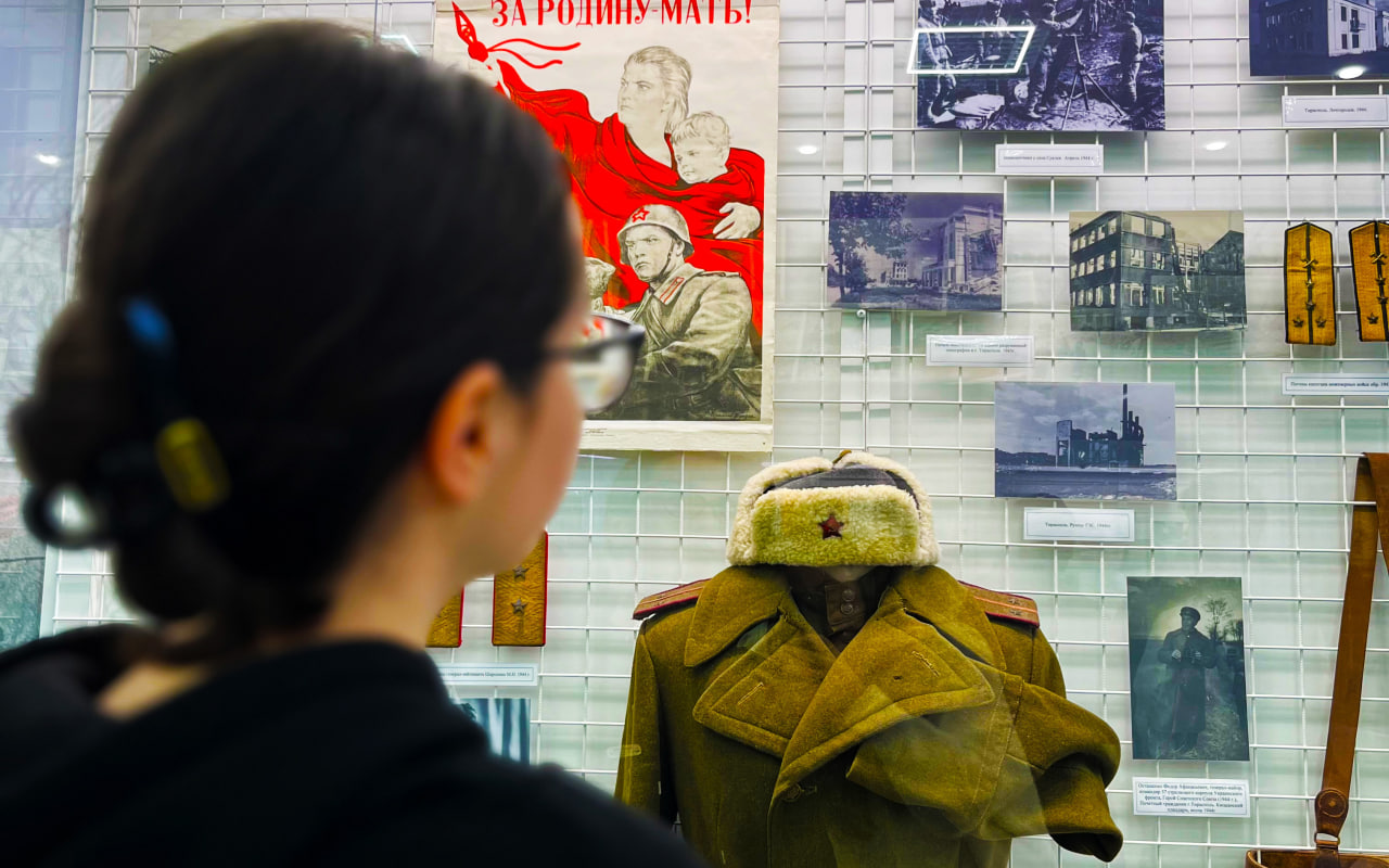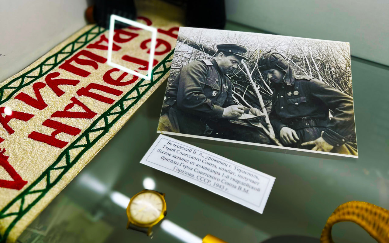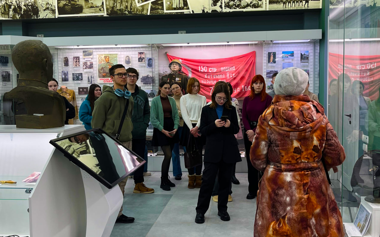 Студенты увидели размещенные в музейных витринах полосатую робу узников концлагерей, военную форму, подлинное оружие и боеприпасы солдат и офицеров советской армии, а также военнослужащих фашистской Германии. В экспозиции представлены фото партизан и подпольщиков, действовавших на территории Приднестровья, медсестер фронтовых госпиталей, отважных летчиц-истребителей, Героев Советского Союза, родившихся на приднестровской земле. Музейные витрины и стенды хранят истории этих людей и их подвигов.