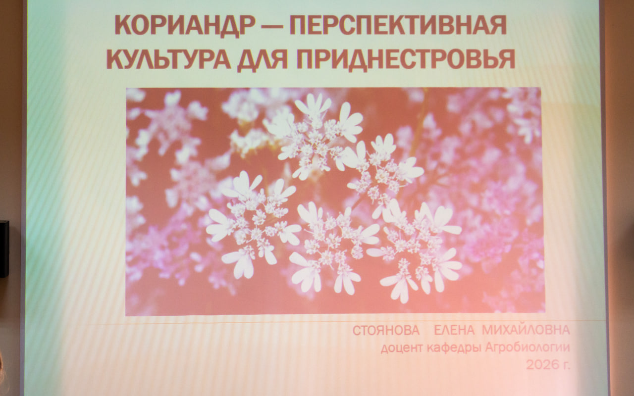 С докладом «Кориандр – перспективная культура для Приднестровья» выступила Е.М. Стоянова. «Кориандр отличается засухоустойчивостью, требует сравнительно невысоких затрат на выращивание, поэтому интродукция и расширение посевных площадей кориандра в регионе является актуальной, экономически и агроэкологически обоснованной», – уверена Елена Михайловна. Е.М. Стоянова рассказала о происхождении и распространении растения, его химическом составе и биологических особенностях, возделывании растения и его последующем использовании в медицине, кулинарии, парфюмерии, текстильной промышленности. Она также отметила, что зелень кориандра часто называют «кинзой», «коляндрой», «кашничем» и др. «В основном кориандр возделывается в Рыбницком и Дубоссарском районах, площади не превышают 200-500 га. Технология выращивания недостаточно отработана для нашей зоны возделывания, рынок сбыта семян также не отлажен, но благодаря высокой адаптивности к засушливым условиям и высокой экономической эффективности, кориандр можно рассматривать как перспективный интродуцент для дальнейшего расширения посевных площадей в Приднестровье», – подытожила Е.М. Стоянова.