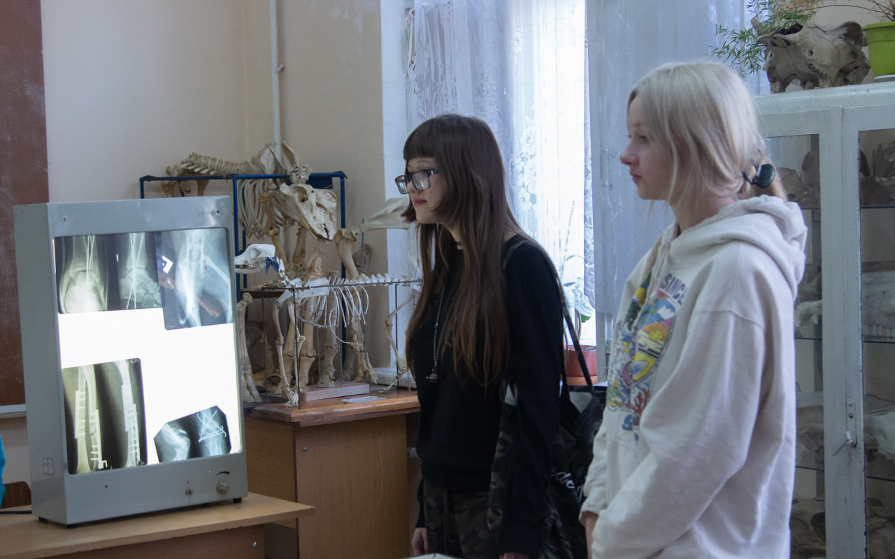 На лекции-демонстрации по ветеринарному делу проводившие ее студенты кафедры ветеринарной медицины дали возможность потенциальным абитуриентам почувствовать себя хирургами. Раскрывая тайны профессии, рассказали о надкостном остеосинтезе, показали рентгеновские снимки костей, закрепленных пластинами, продемонстрировали процесс фиксации кости серкляжами, обеспечивающими ее правильное срастание. Также ребятам поведали о свойствах меда, его отличии от крем-меда и, для лучшего понимания различий, предложили продегустировать медовую продукцию.