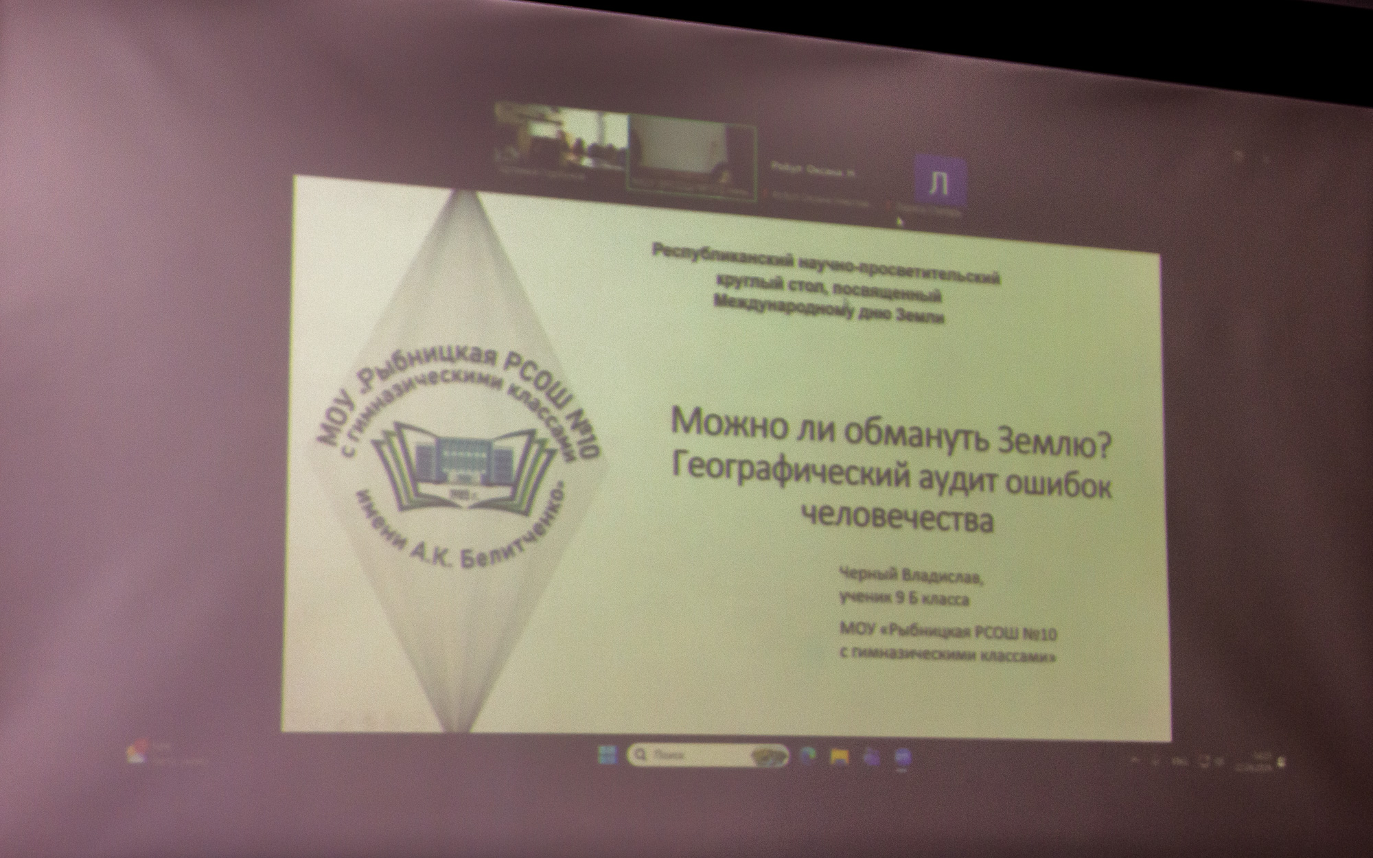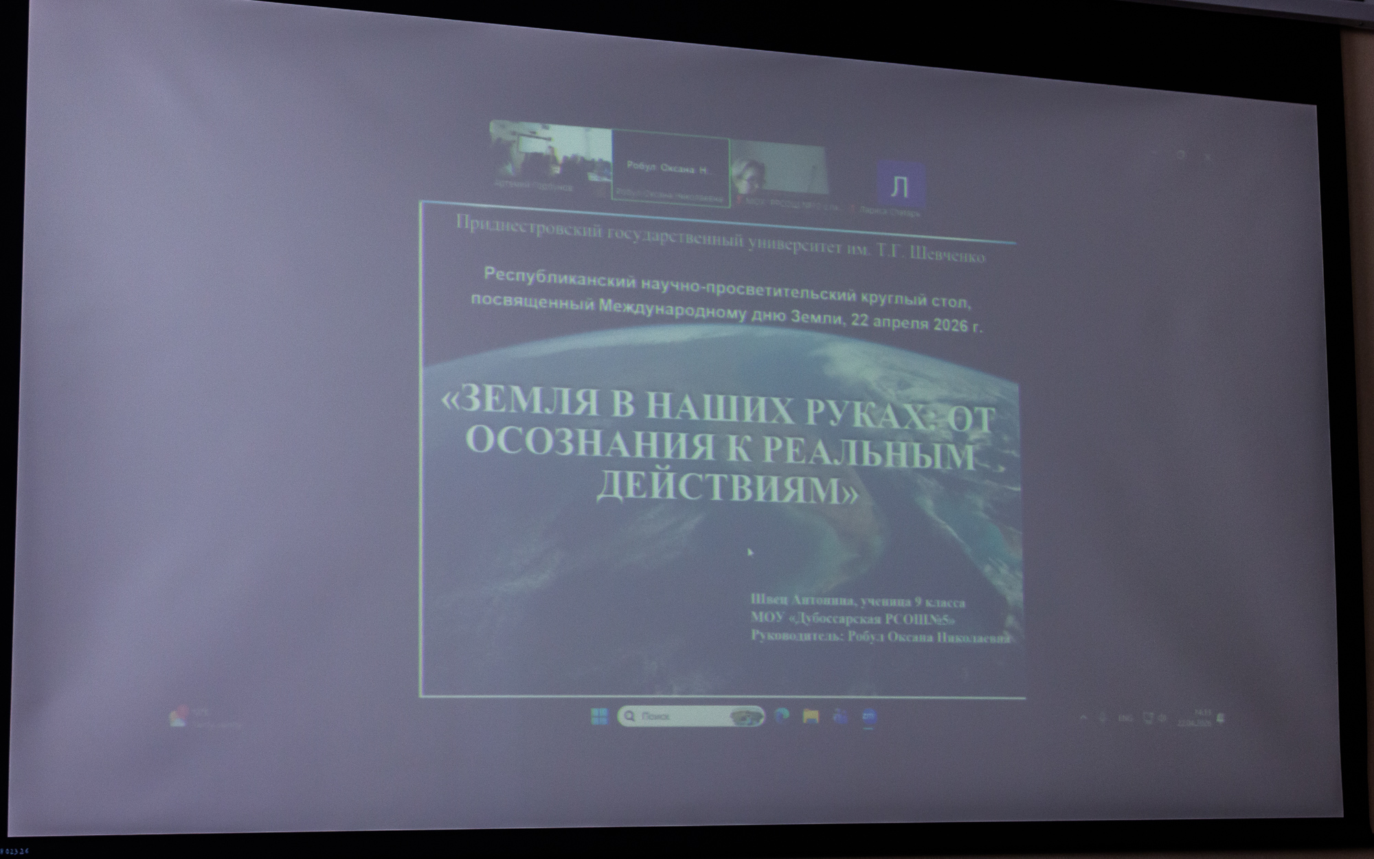Учащаяся 9 класса Дубоссарской школы № 5 А. Швец под руководством учителя географии высшей квалификационной категории О.Н. Робул подготовила доклад «Земля в наших руках: от осознания к реальным действиям». В сообщении были затронуты вызовы эпохи антропоцена и важность международного сотрудничества в формировании экосознания.