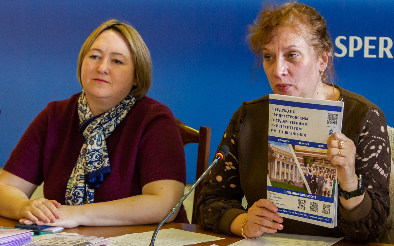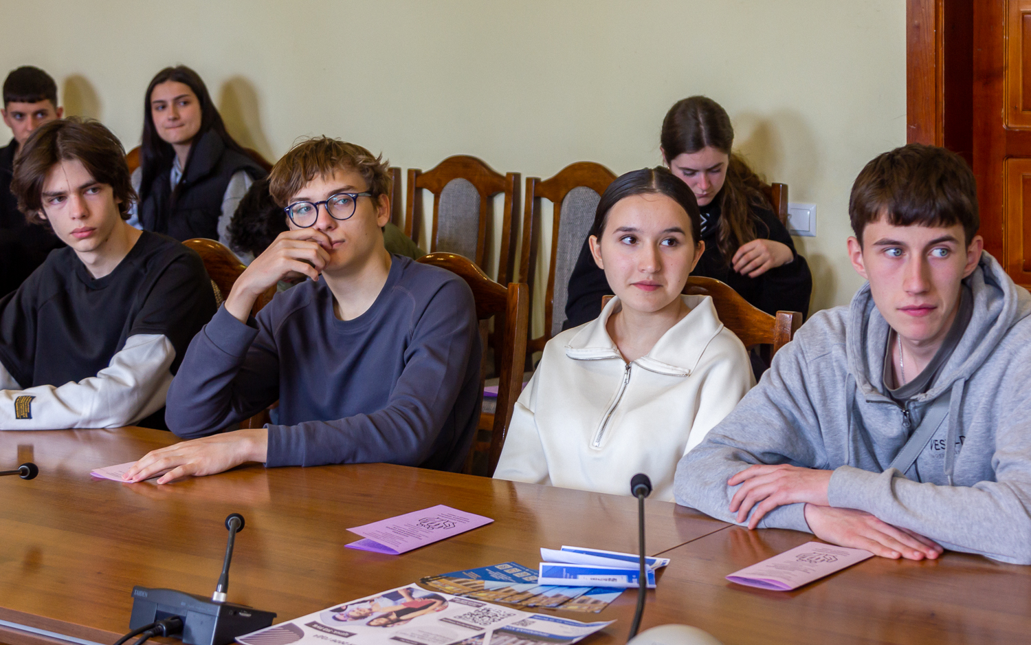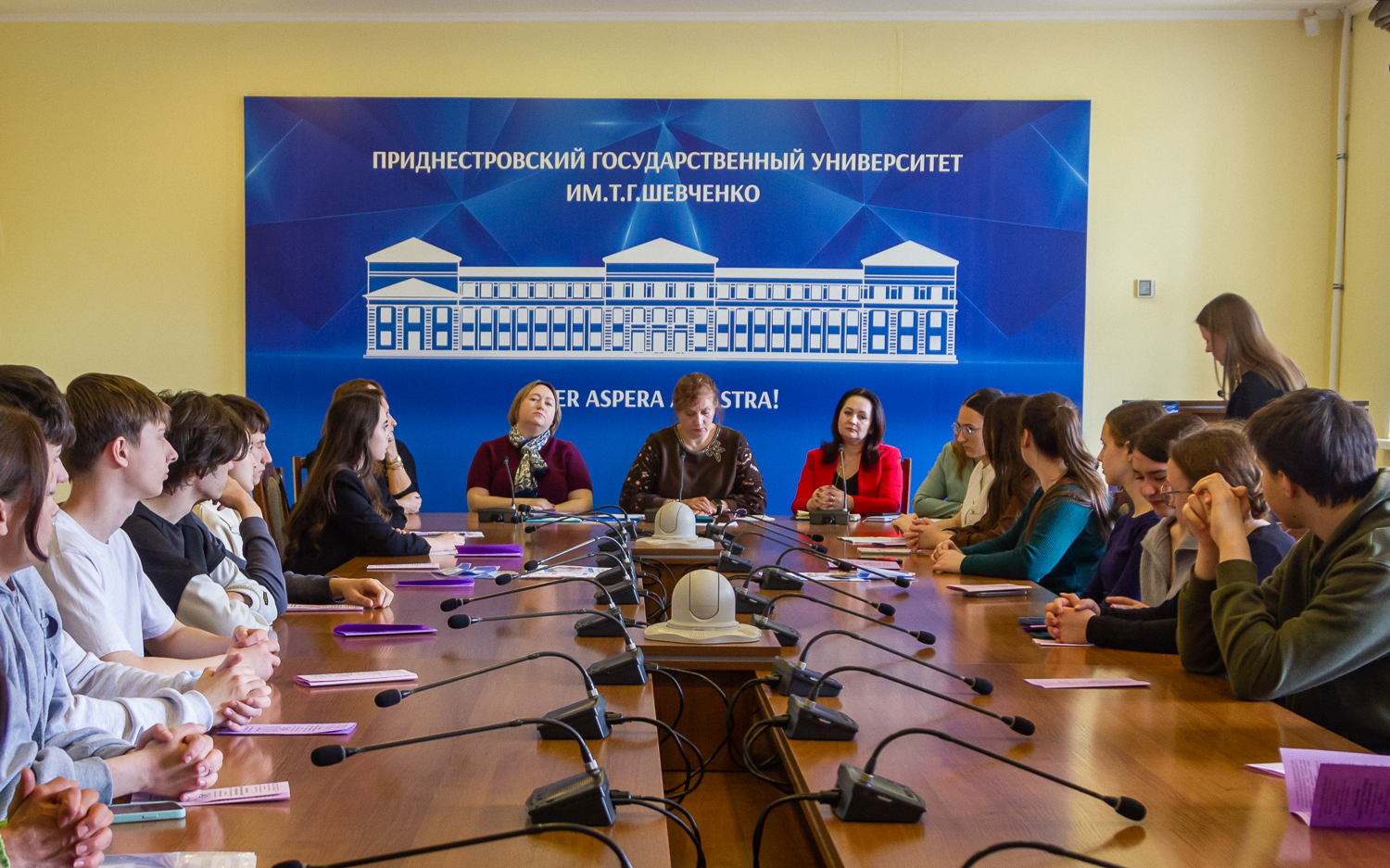 Встреча началась с демонстрации проморолика о ПГУ им. Т.Г. Шевченко как о современном центре подготовки профессионалов. Школьникам рассказали, что обучение в вузе ведется на трех официальных языках, а ежегодный выпуск составляет более двух тысяч специалистов. С 2023 года выпускники вместе с дипломом об окончании Приднестровского государственного университета получают дипломы, идентичные дипломам вузов Российской Федерации.