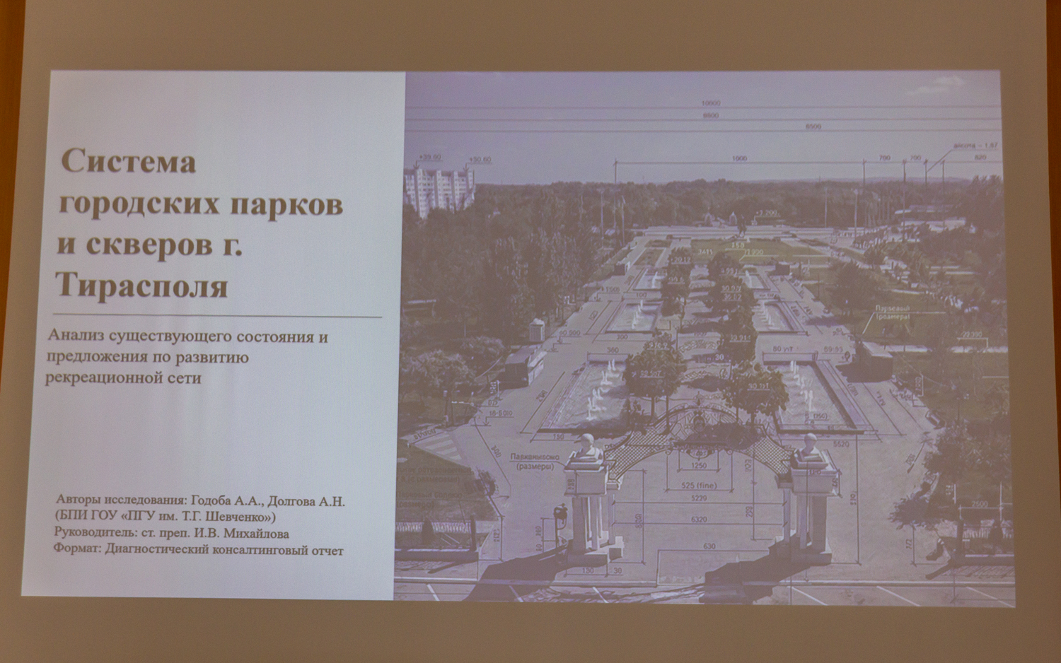 Студентки Бендерского политехнического института А. Годоба и А. Долгова представили исследование «Система городских парков и скверов Тирасполя: анализ существующего состояния и предложения по развитию рекреационной сети». Авторы отметили, что дендропарк обладает высоким экологическим и образовательным потенциалом, однако испытывает дефицит инфраструктуры, а ряд городских пространств нуждается в комплексном обновлении. В качестве ключевого объекта они выбрали парк «Победа» и предложили его реконструкцию как центрального элемента рекреационной системы.